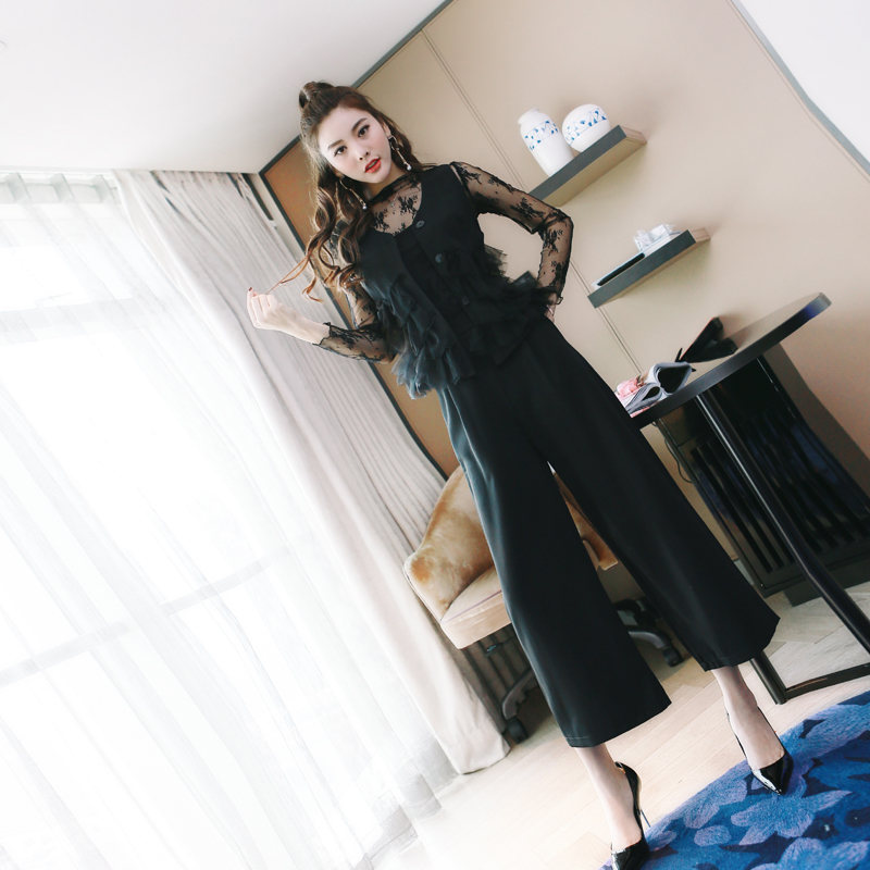 / 名媛氣質時尚闊腿褲三件套裝女2018春秋性感新款修身蕾絲馬夾套裝