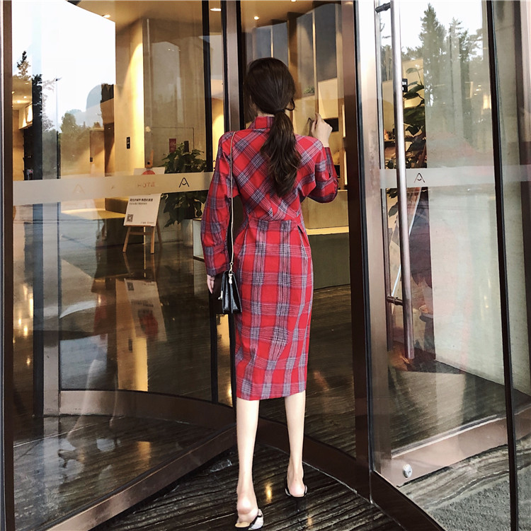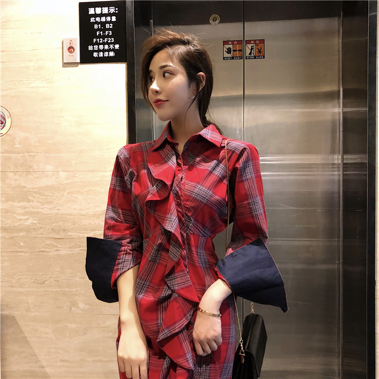 / 2018秋裝新款韓版小清新中長款晚晚風收腰顯瘦花邊格子襯衫連衣裙