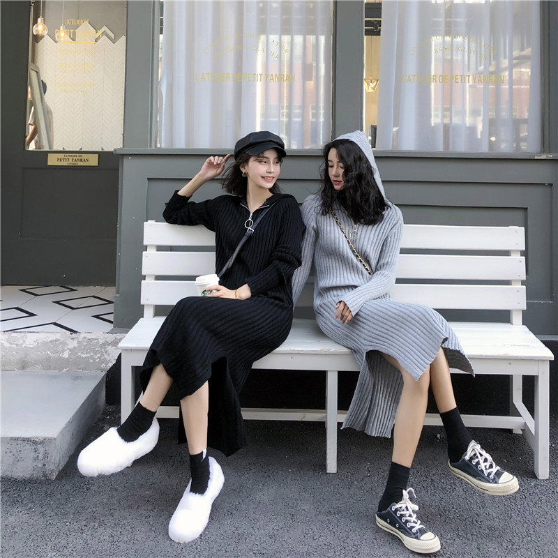 / 秋冬新款時尚chic百搭裙子連帽長款過膝毛衣裙長袖針織連衣裙女潮