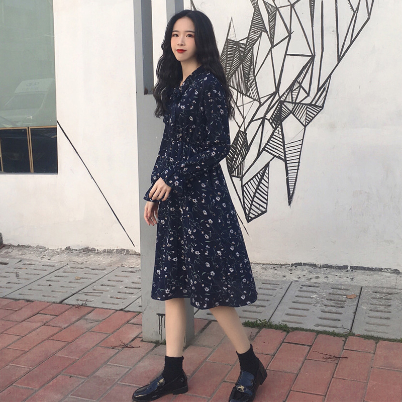 / 秋裝韓版氣質小清新領口系帶中長款長袖碎花連衣裙顯瘦雪紡長裙女