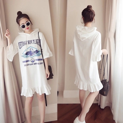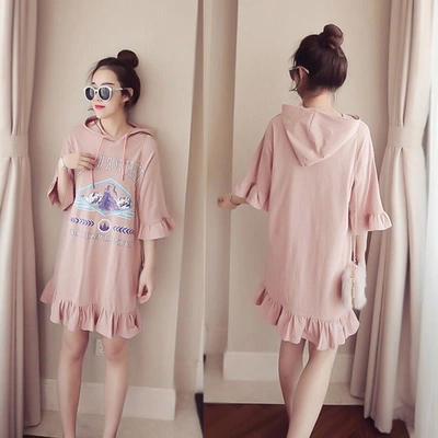 / 夏裝軟妹字母休閑連帽七分袖寬松荷葉邊連衣裙女中長款學生打底裙
