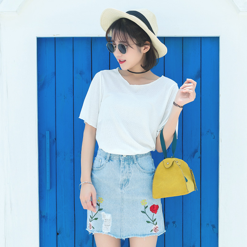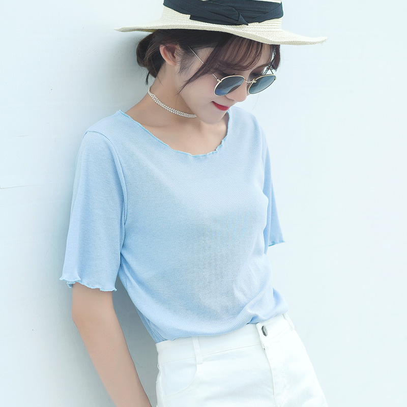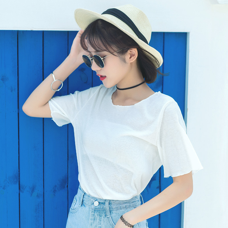 夏季新款韓版女裝圓領短袖針織衫白色百搭V領學生打底衫上衣