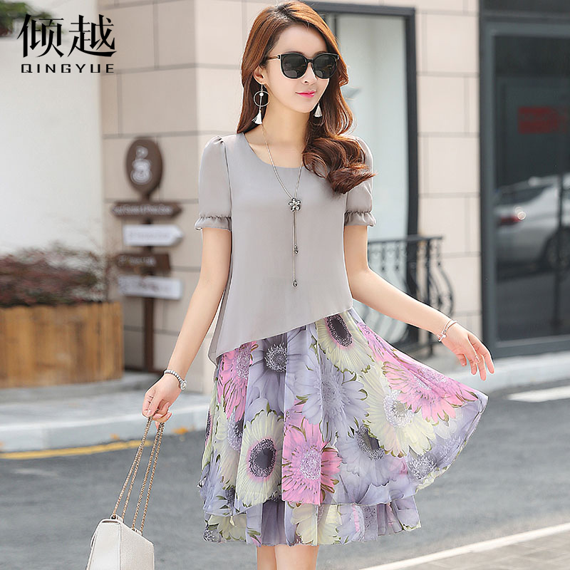 / 傾越2017夏季新款短袖淑女中長款裙子小清新顯瘦印花雪紡連衣裙女