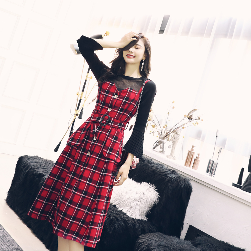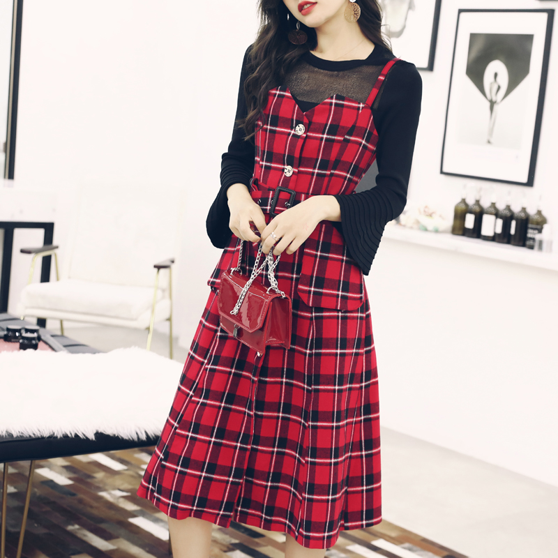 / 秋裝女2018新款針織長袖上衣吊帶裙兩件套套裝顯瘦收腰格子連衣裙