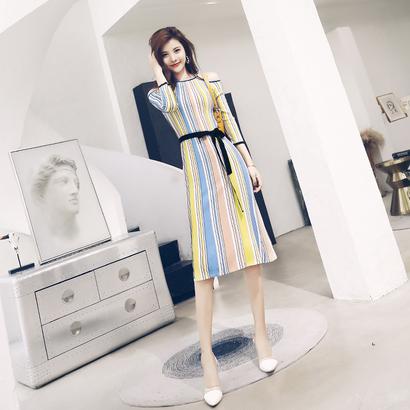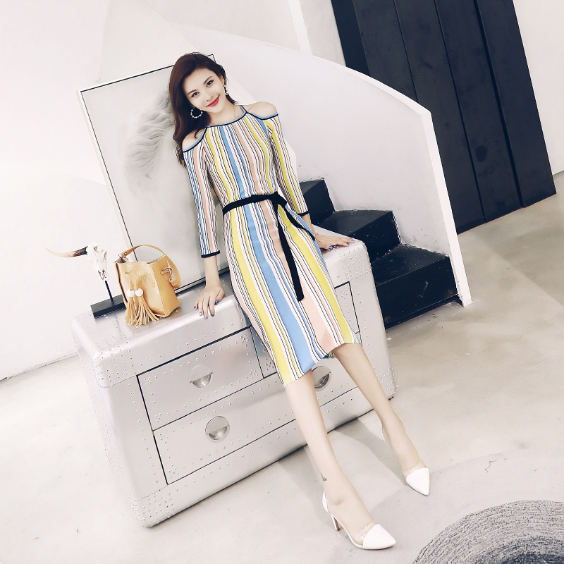 連衣裙女夏2018新款修身顯瘦露肩針織裙子慵懶風港味復古chic裙秋