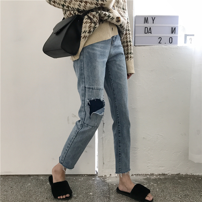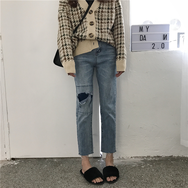 / 秋裝女裝韓版寬松高腰顯瘦破洞牛仔褲直筒褲九分褲學生闊腿褲長褲