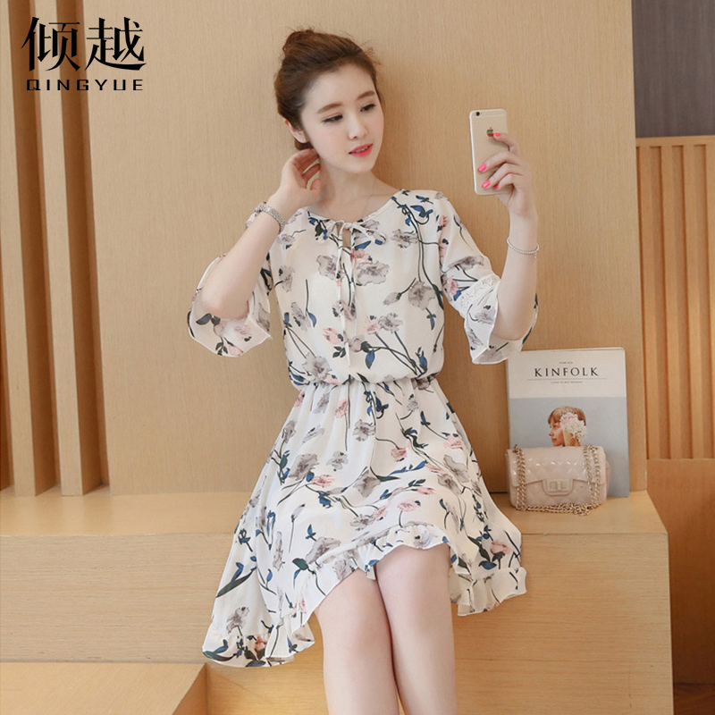 傾越2017春夏新款韓版女裝雪紡連衣裙顯瘦中長款魚尾裙子碎花長裙