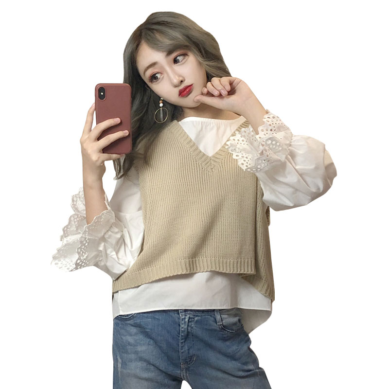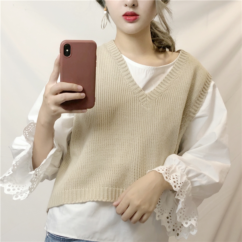 / 秋季女裝韓版V領寬松針織衫馬甲背心短款無袖毛衣上衣外套+白襯衫