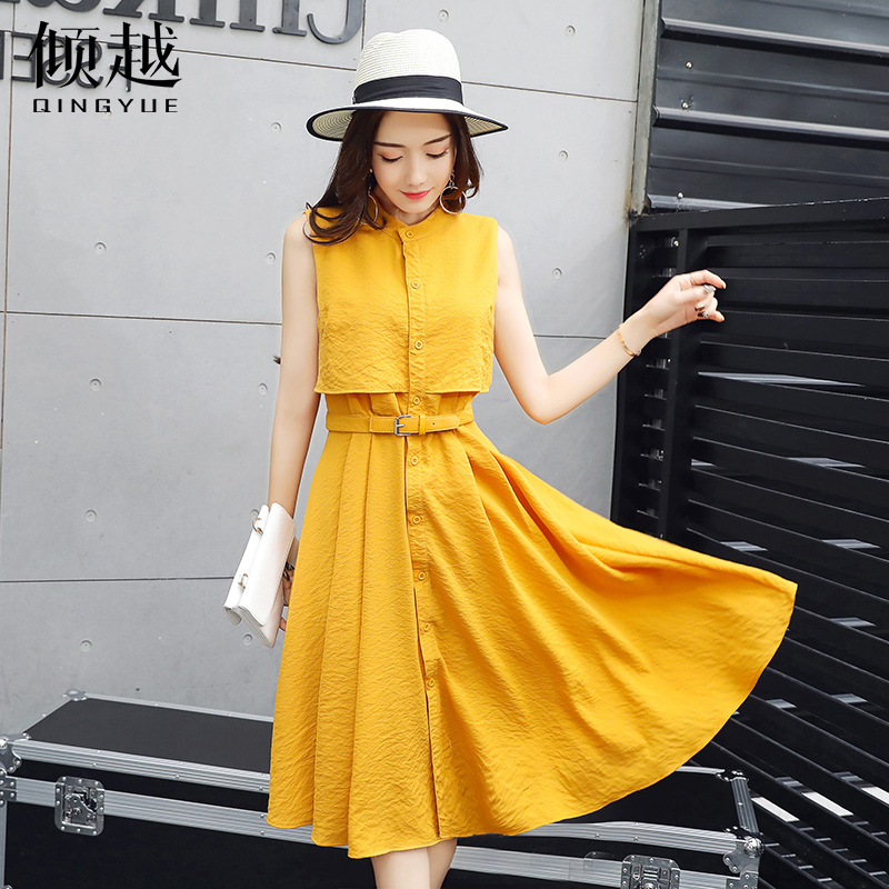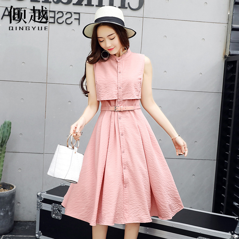 傾越2017夏裝新款韓版顯瘦無袖襯衫連衣裙女裝氣質中長款A字裙潮
