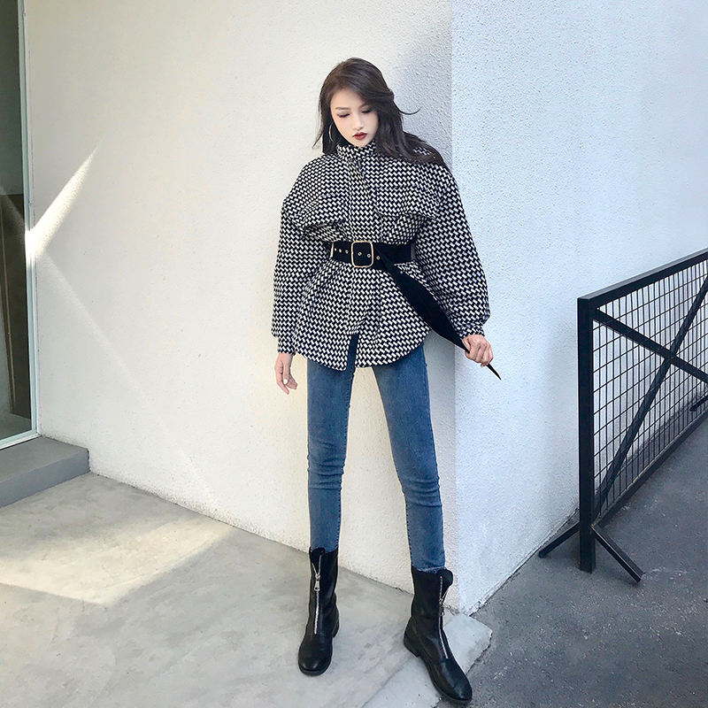 / 2018秋冬新款韓版寬松加厚保暖時尚格子系帶氣質中長款chic外套女