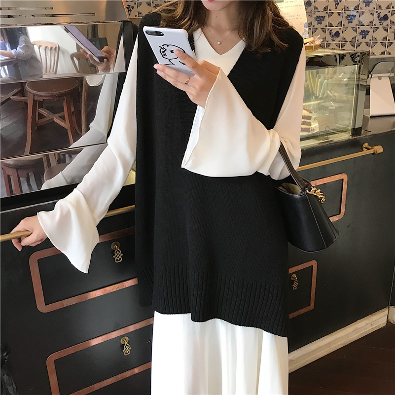 / 新款韓版秋季上衣女外穿復古chic時尚寬松V領前短后長馬甲針織衫