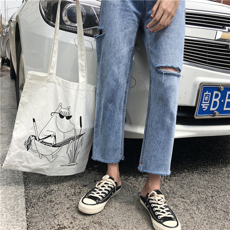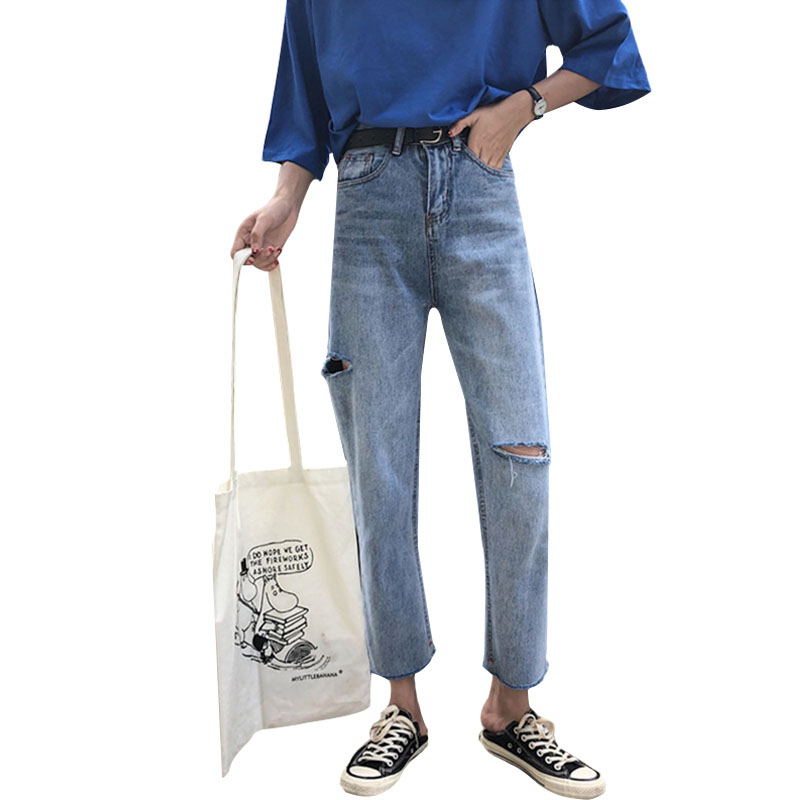 / 秋裝女裝韓版寬松BF風高腰顯瘦水洗破洞牛仔褲學生九分褲直筒褲潮