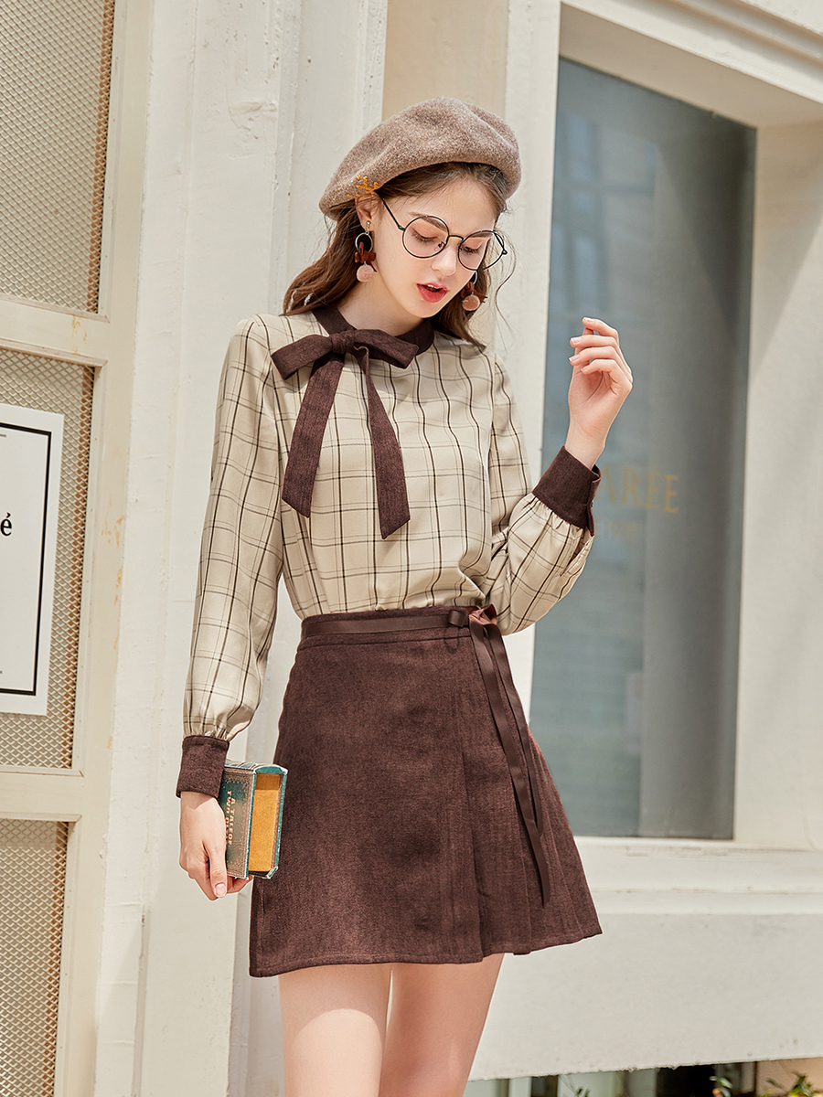/ MG小象長袖格子襯衫女秋2018新款時尚高腰半身裙蝴蝶結chic上衣潮