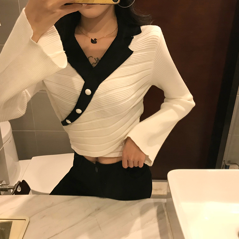 / chic新款韓版修身顯瘦上衣女裝百搭氣質時尚喇叭袖秋冬打底針織衫