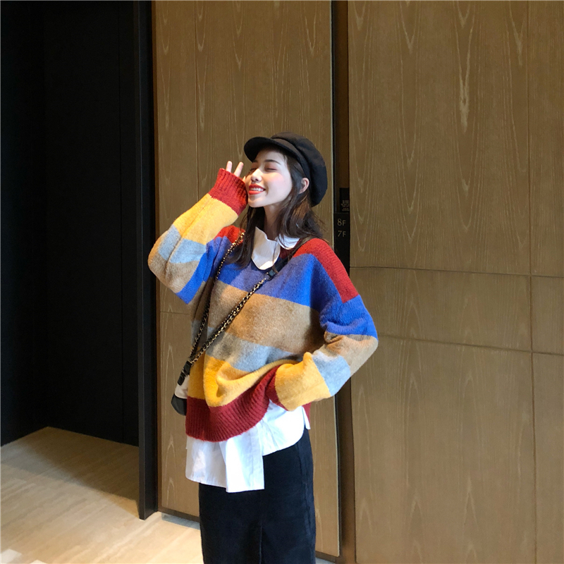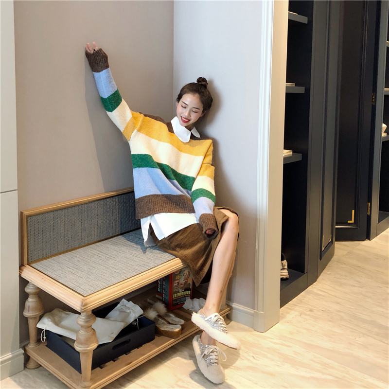 彩色加厚寬條紋毛衣燈芯絨半身裙不規則襯衫時尚套裝chic三件套女