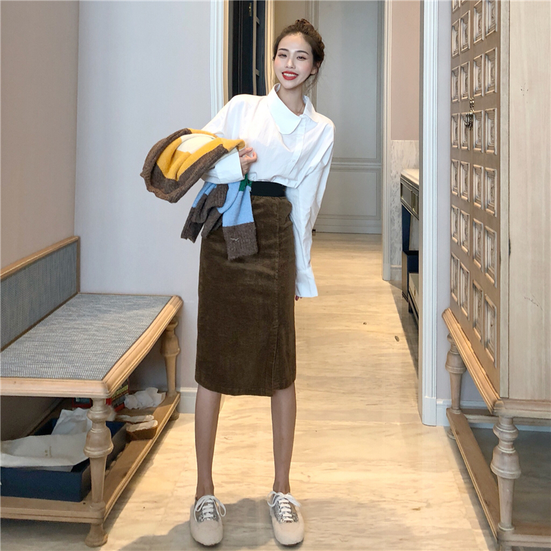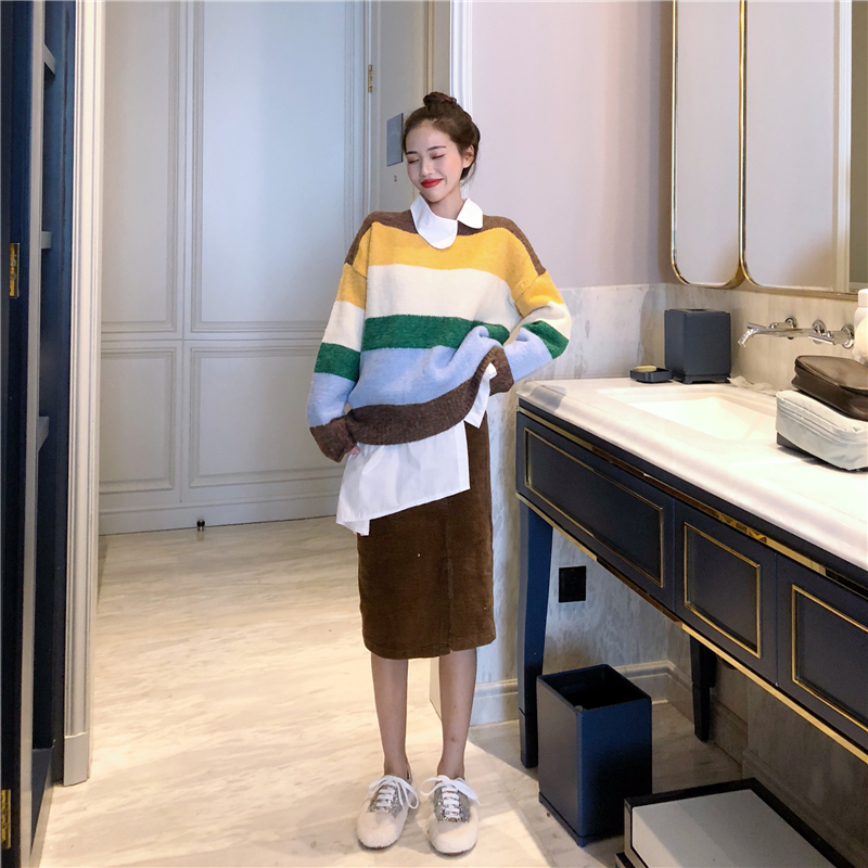 / 彩色加厚寬條紋毛衣燈芯絨半身裙不規則襯衫時尚套裝chic三件套女