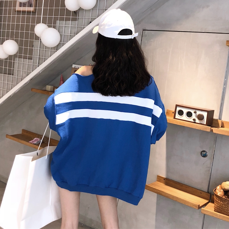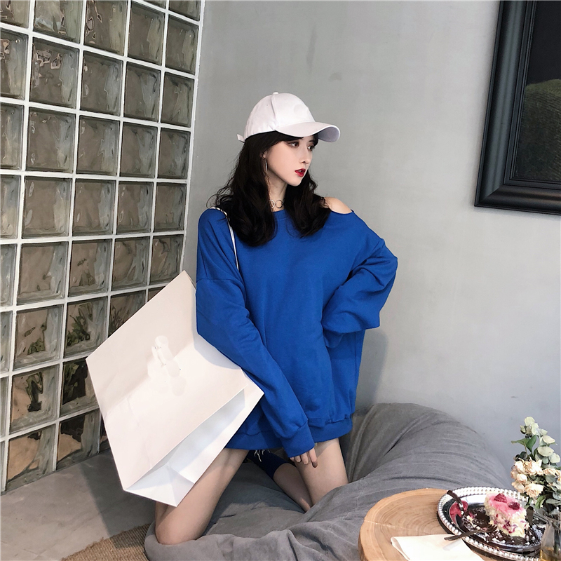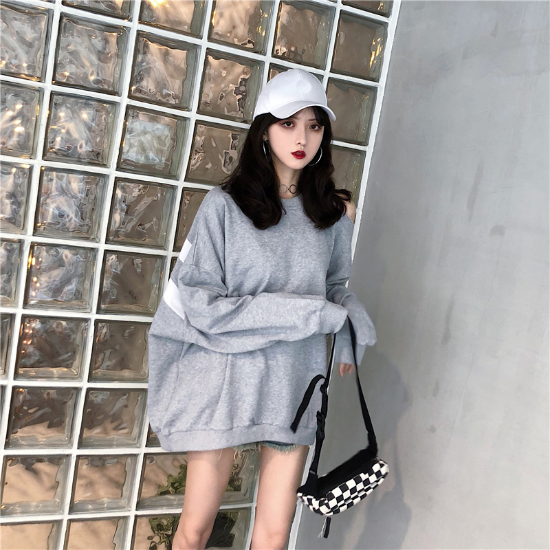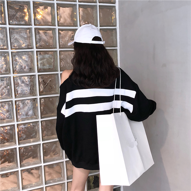 / 2018秋裝新款韓版寬松純色學生原宿bf慵懶風露肩拼條衛衣長袖上衣