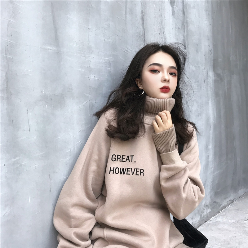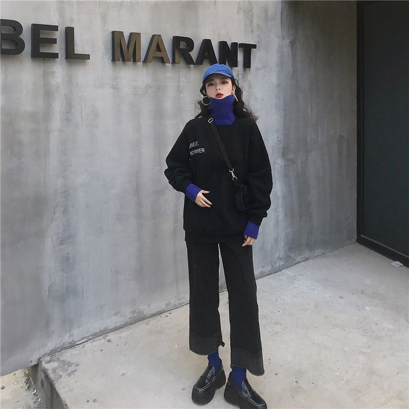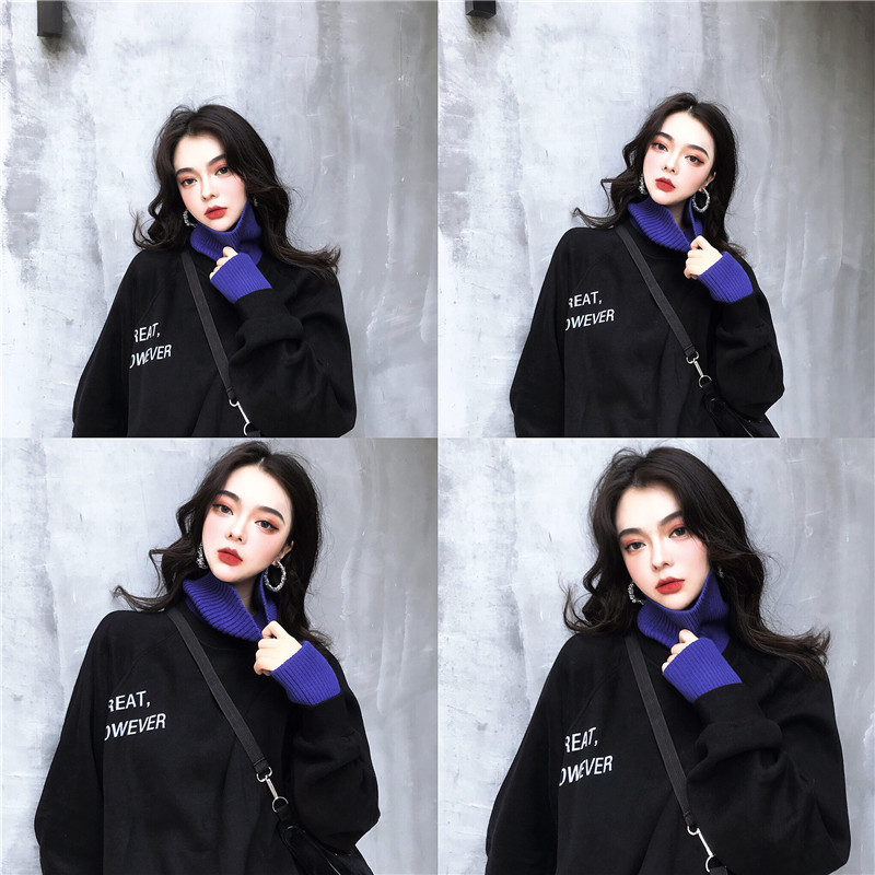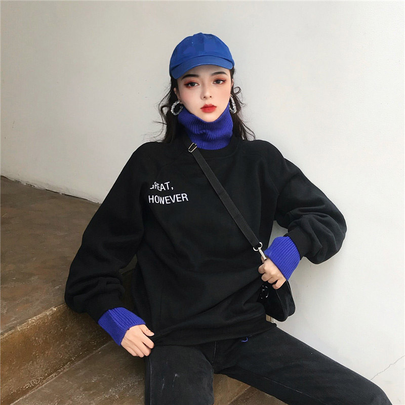/ 港風chic寬松加絨套頭衛衣字母針織高領撞色設計感百搭假兩件上衣