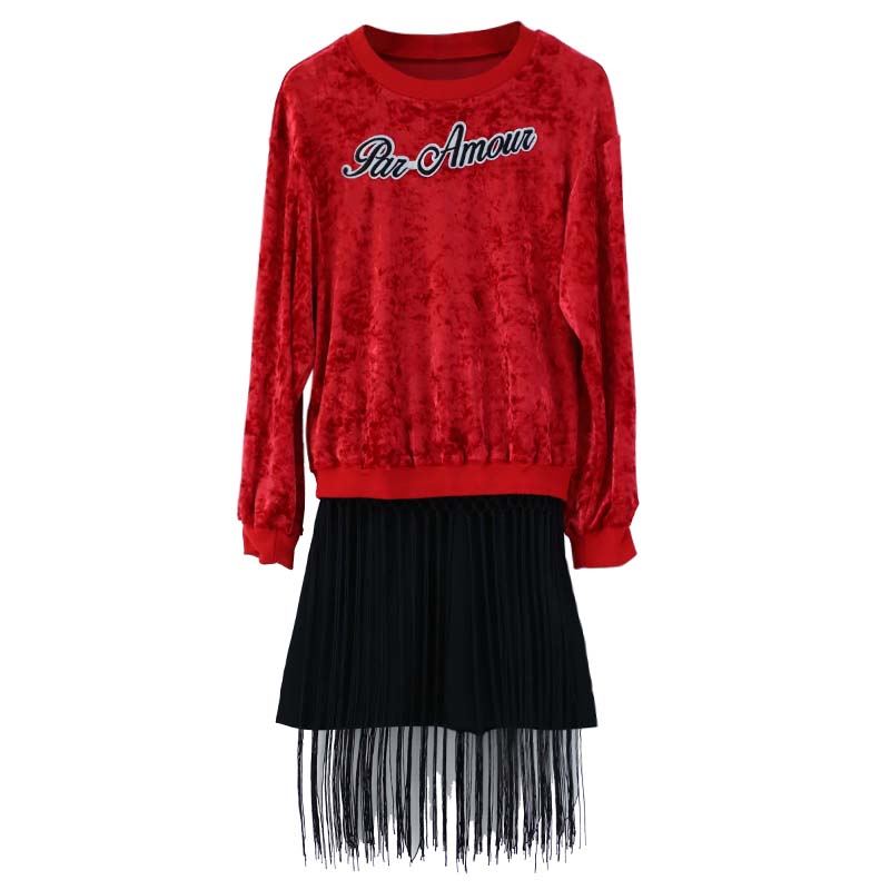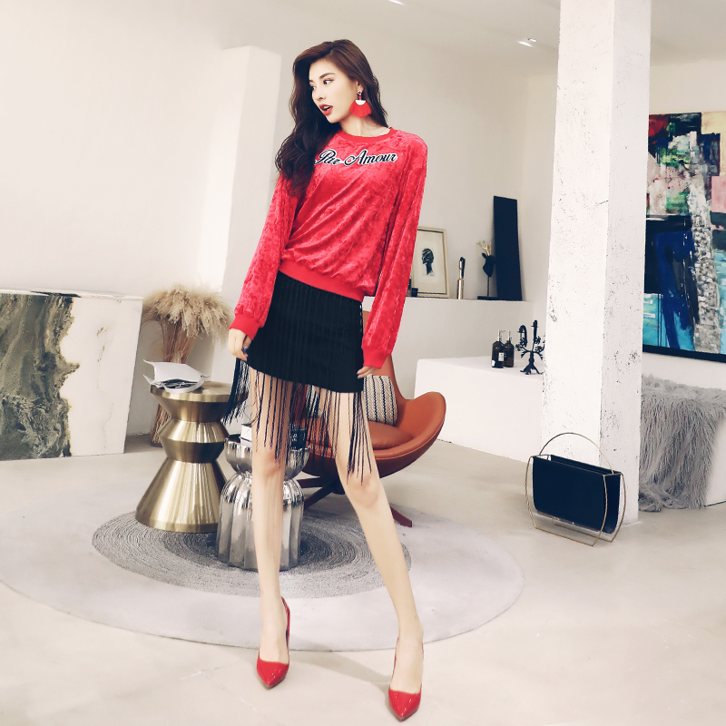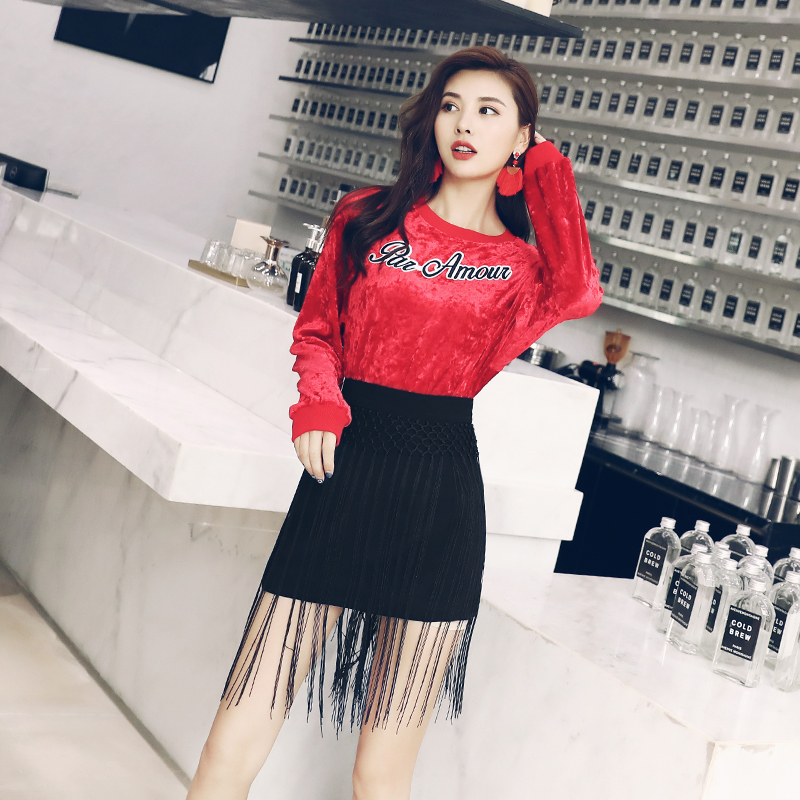 / 紅色超火衛衣女套裝裙2018新款秋季長袖上衣流蘇半身短裙兩件套潮