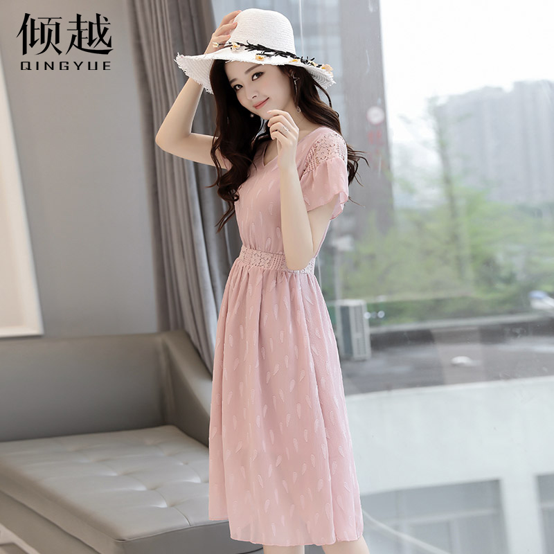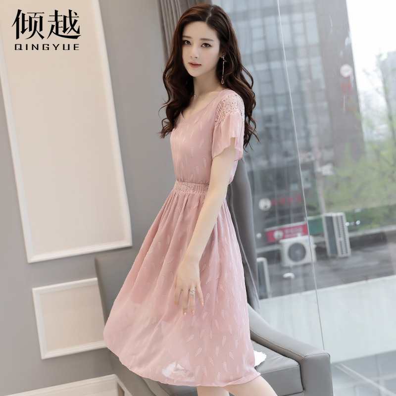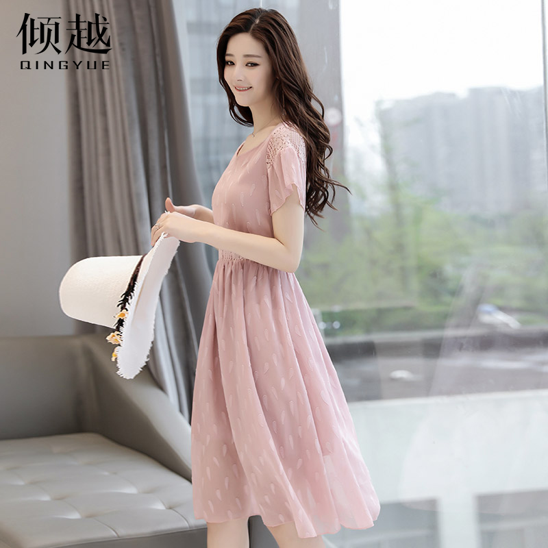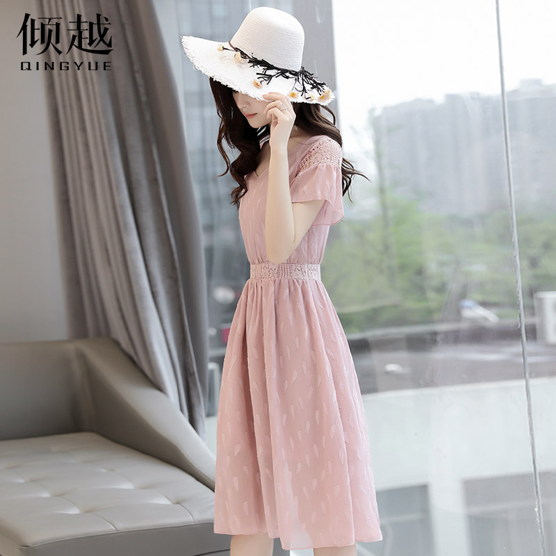 雪紡連衣裙女夏季新款2017女裝潮韓版時尚修身顯瘦氣質蕾絲裙子仙