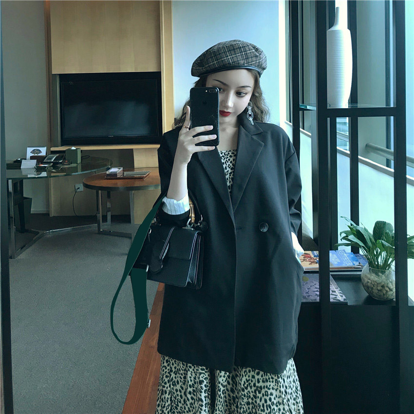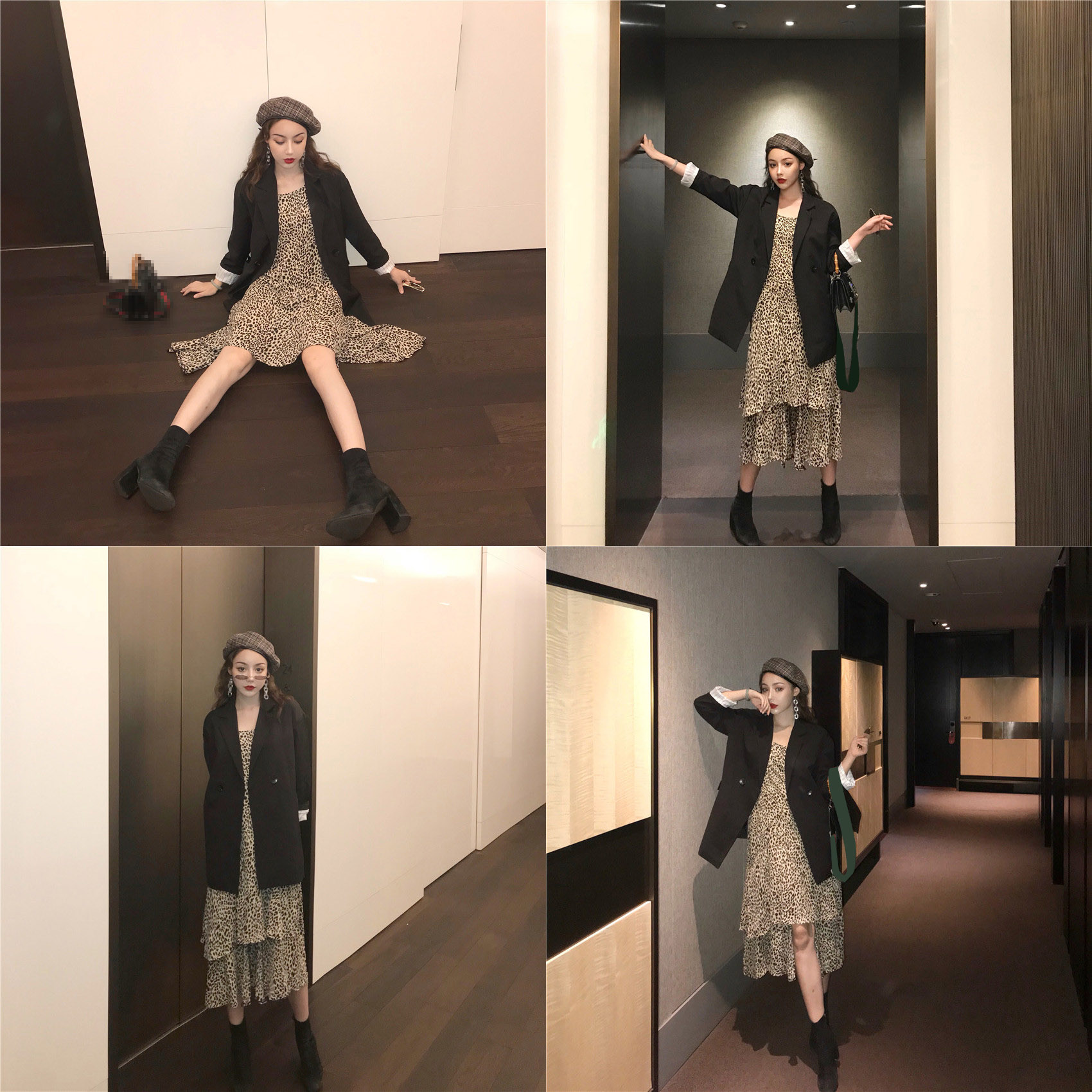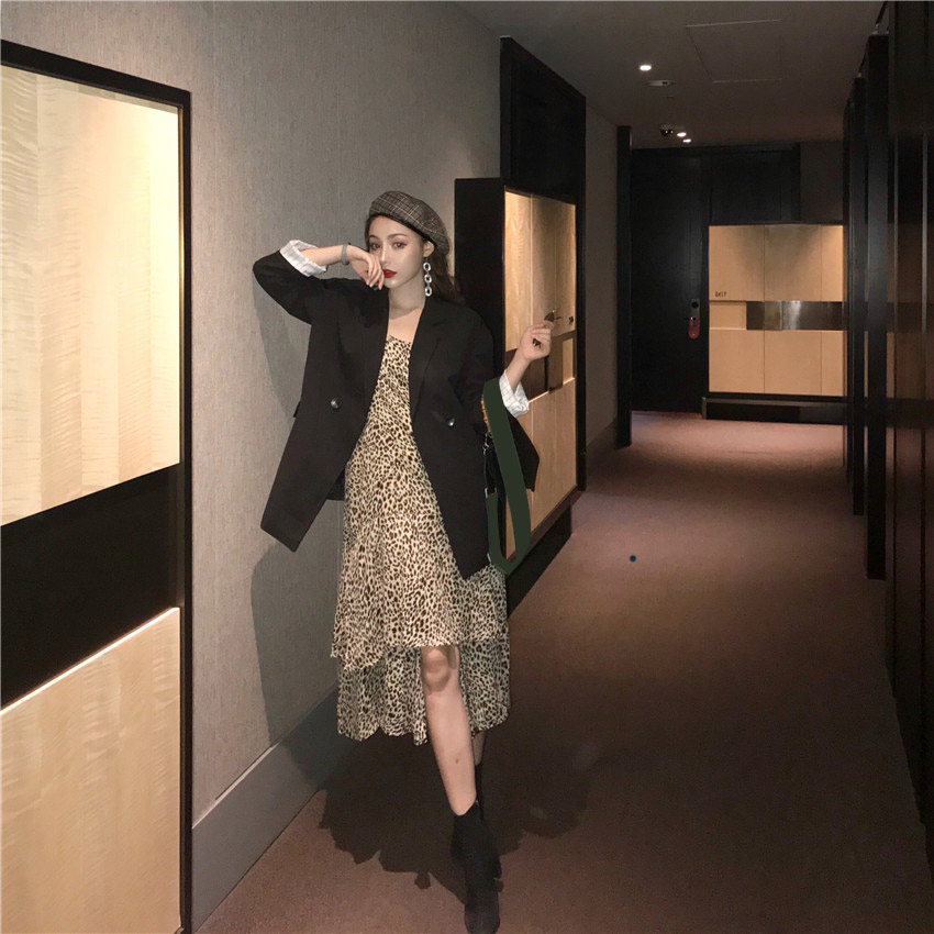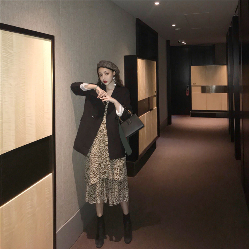 / 秋冬休閑百搭帥氣西裝外套女+中長款豹紋不規則下擺連衣裙兩件套