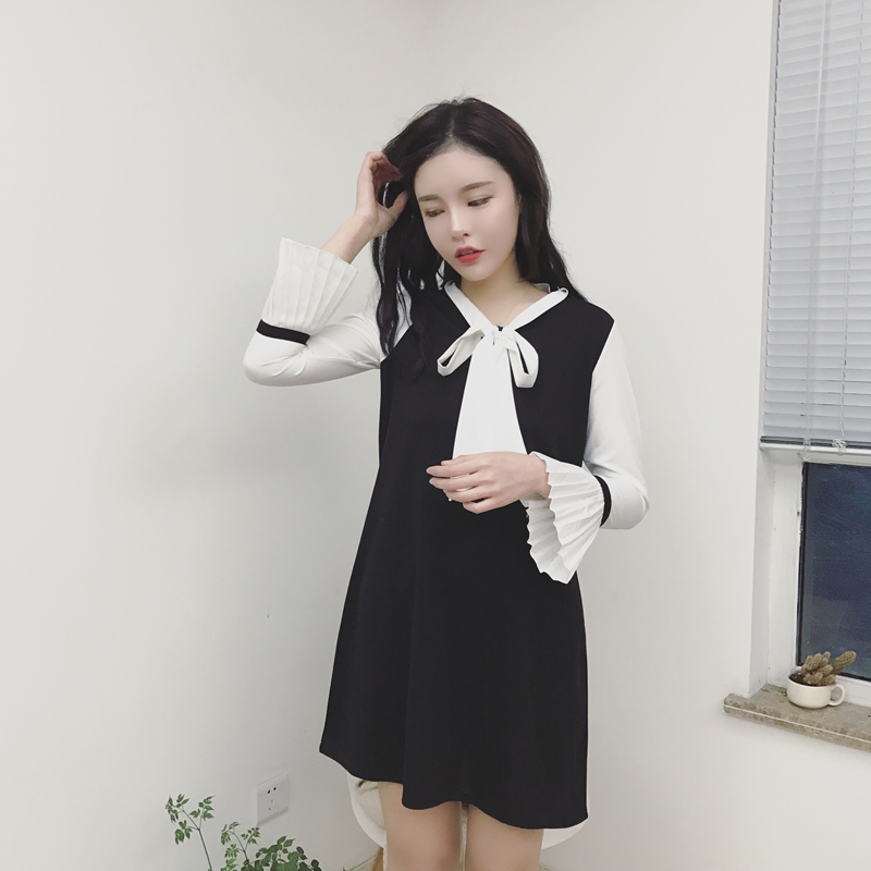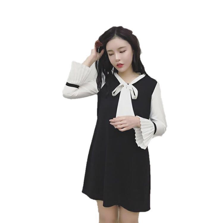 港味時尚新款韓版秋季假兩件系帶蝴蝶結黑白拼色喇叭袖連衣裙女潮