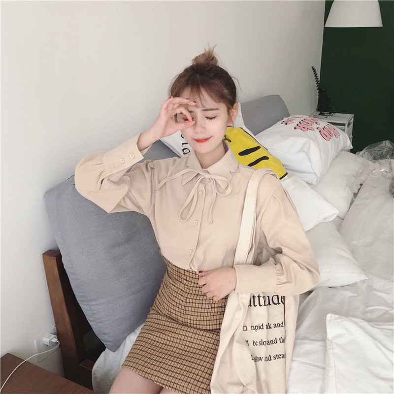 / 秋裝女裝韓版甜美學院風領口不規則系帶長袖襯衣學生休閑襯衫上衣