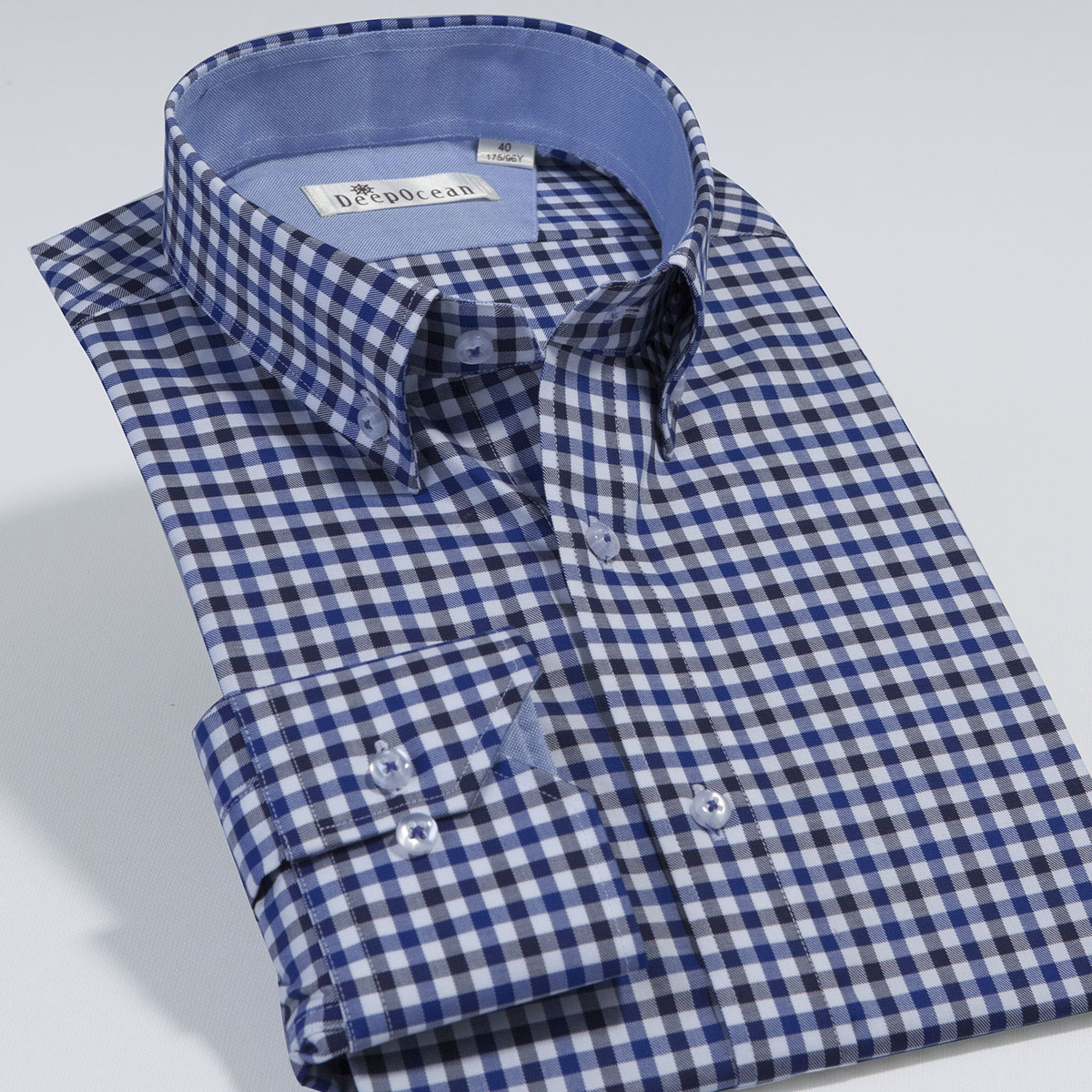 深海格子襯衫襯衣男長袖釘扣領時尚商務修身純棉免燙秋裝男裝