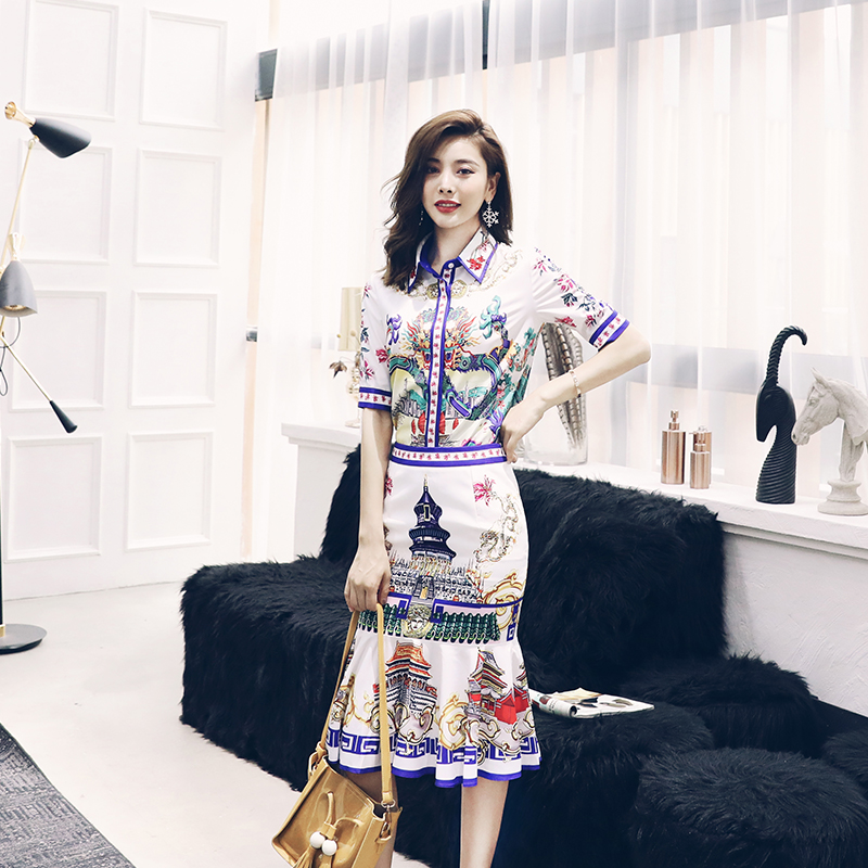 / S秀2018女夏季新款印花裙子兩件套中長款魚尾裙半身裙套裝