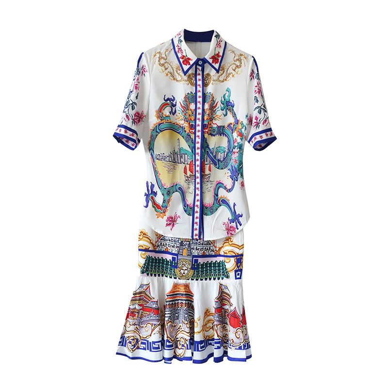 S秀2018女夏季新款印花裙子兩件套中長款魚尾裙半身裙套裝