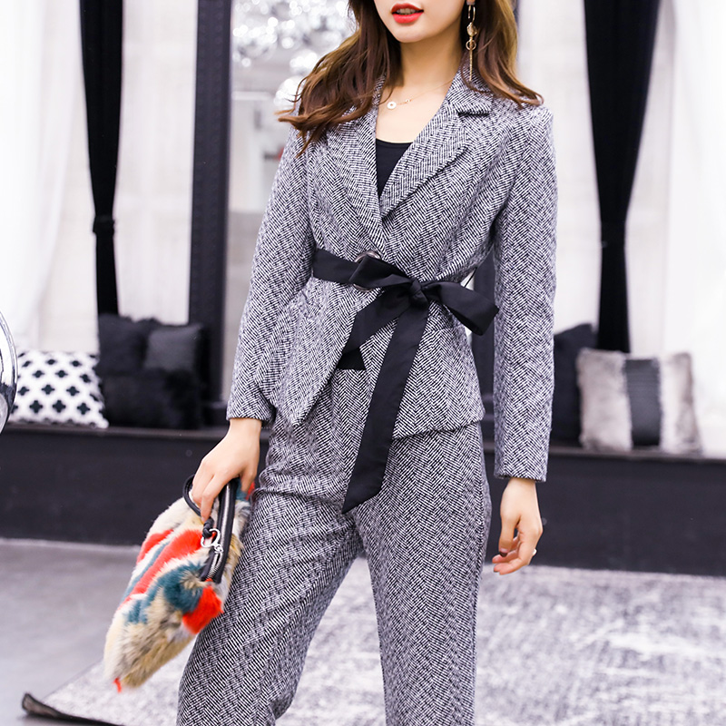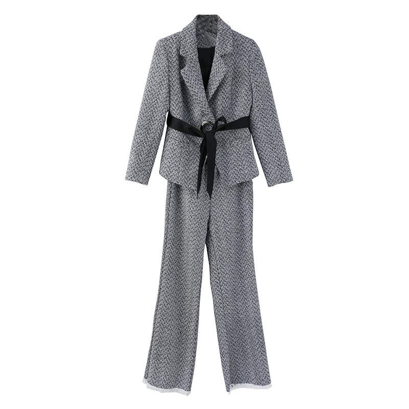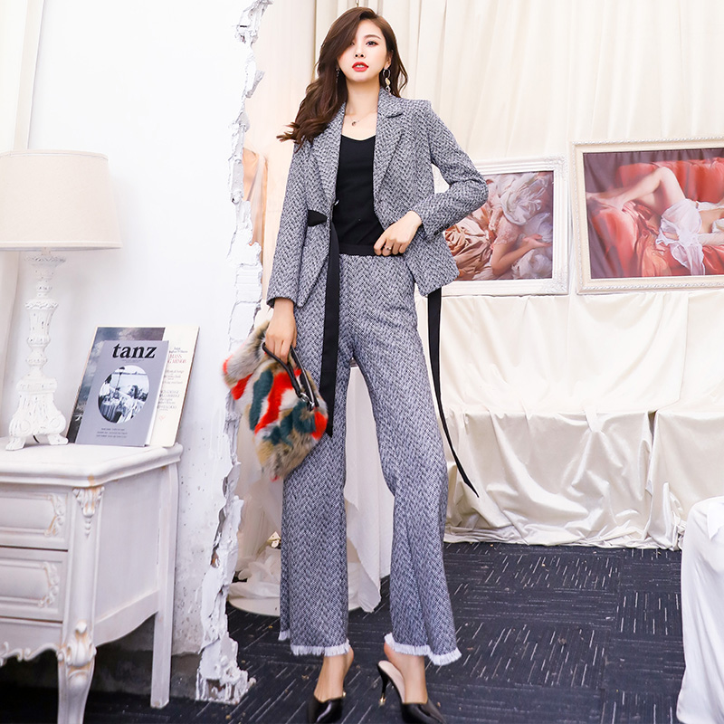2018冬季新款女裝毛呢闊腿褲時尚顯瘦兩件套氣質女神范洋氣套裝潮