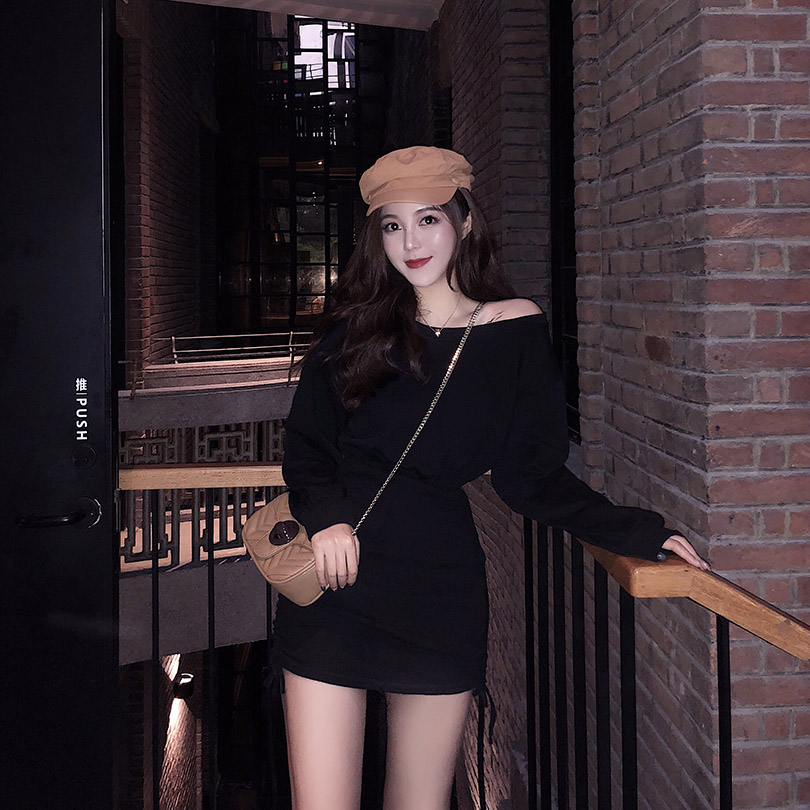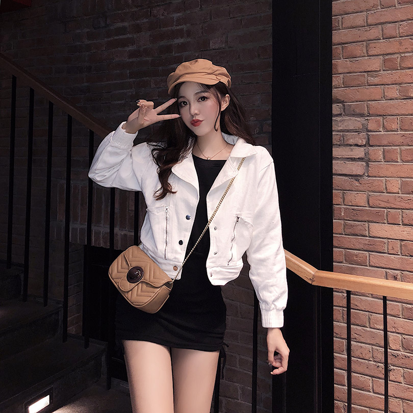 / 港味新款短款寬松顯瘦夾克衫白色牛仔外套女+露肩包臀抽繩連衣裙
