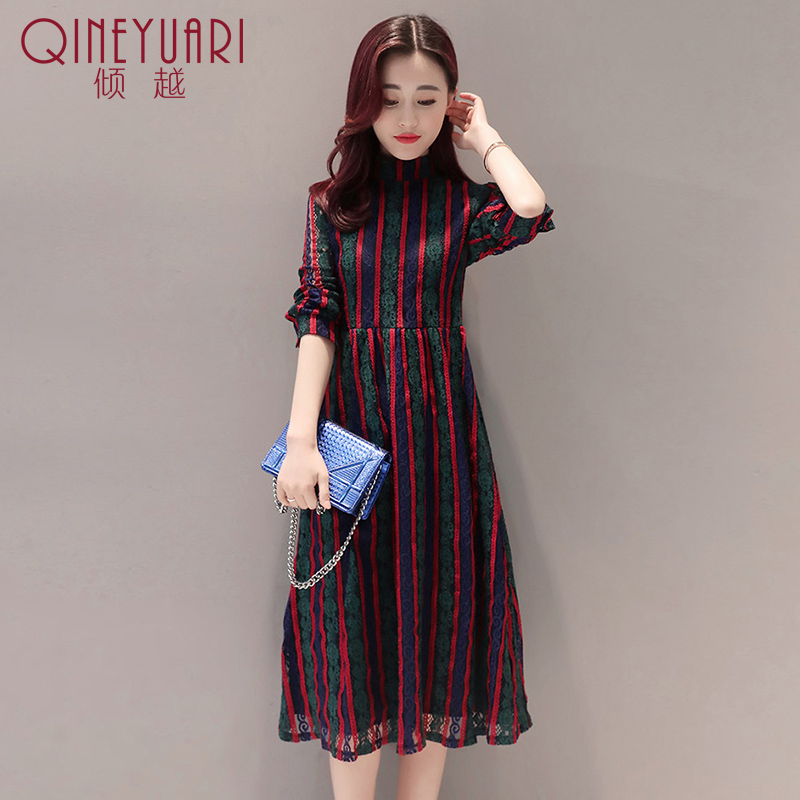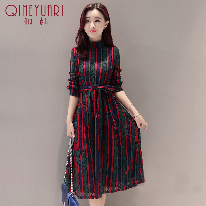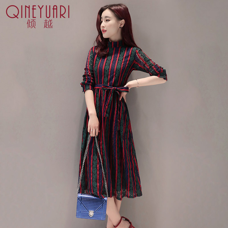 傾越蕾絲鏤空連衣裙2017春季新款韓版女裝長袖系帶豎條紋長款裙子