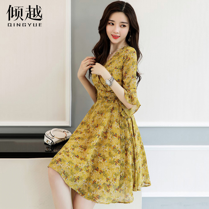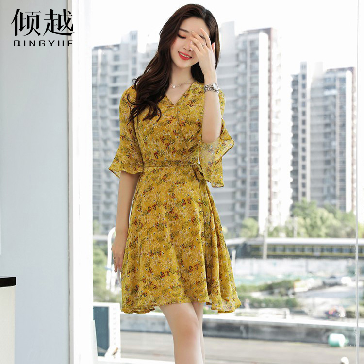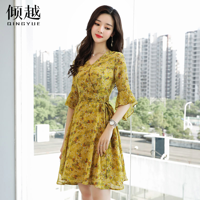 / 2017夏裝新款女裝碎花連衣裙女半袖荷葉袖韓版系帶收腰a字沙灘裙