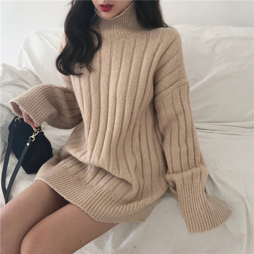 韓國chic秋裝新款時尚慵懶半高領質感坑條毛衣針織衫中長款上衣女