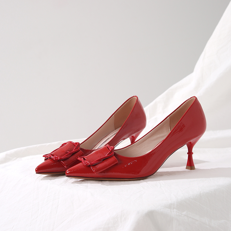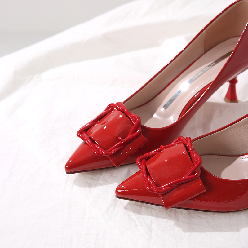 MG小象時尚方扣高跟鞋女秋季新款2018亮面尖頭皮鞋細跟淺口單鞋潮