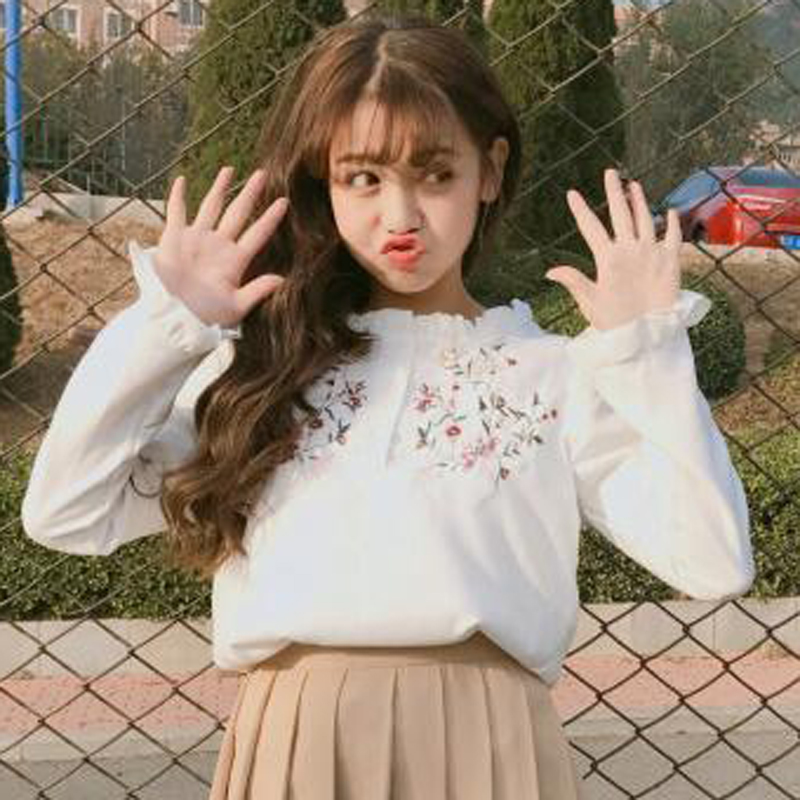 / 秋裝女裝韓版小清新甜美花朵刺繡寬松長袖襯衫學生襯衣上衣打底衫