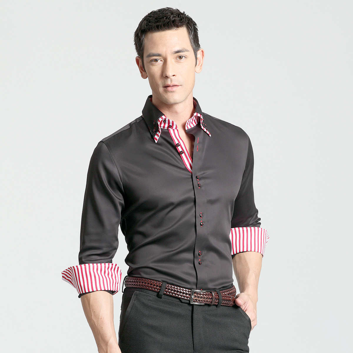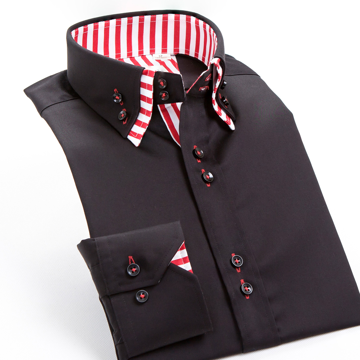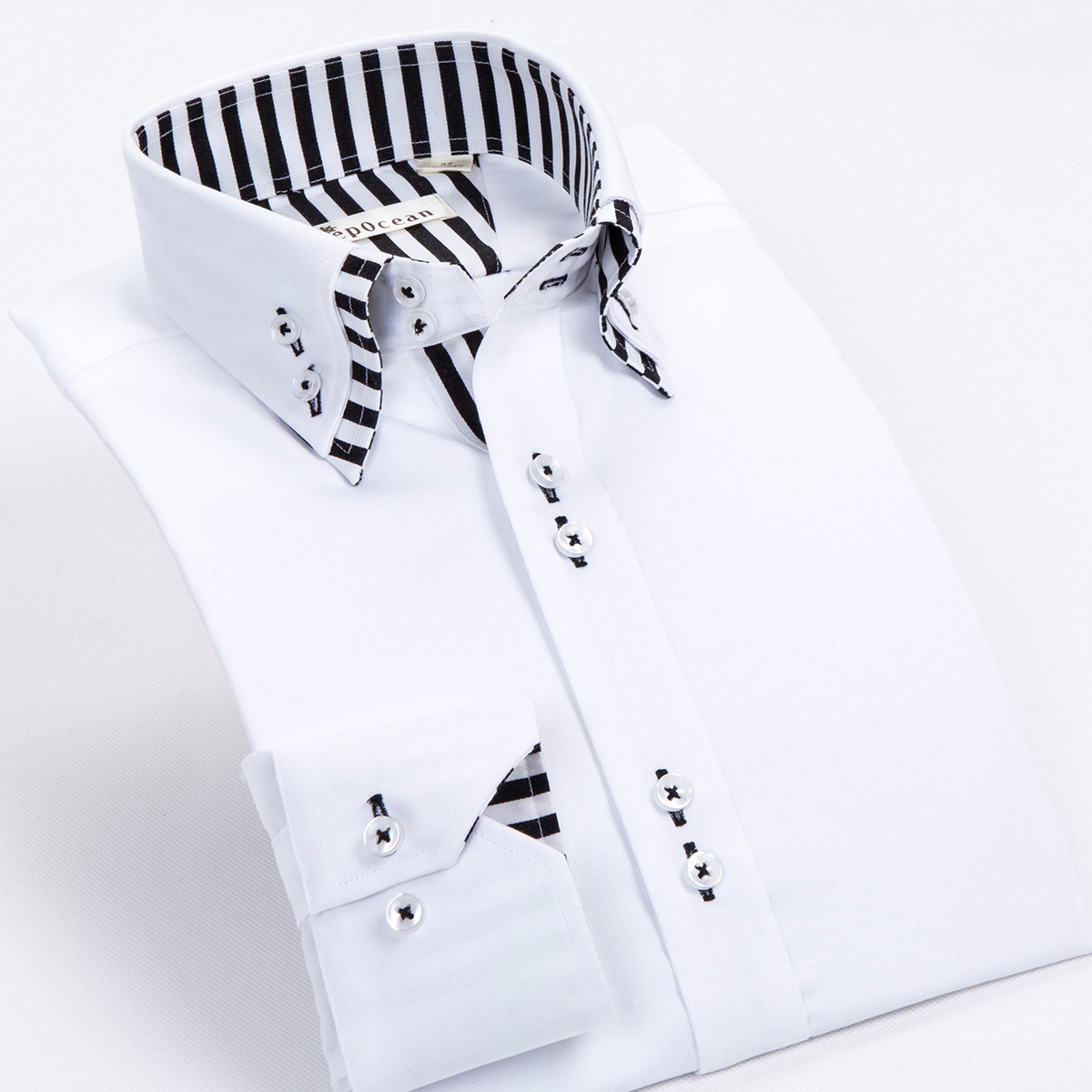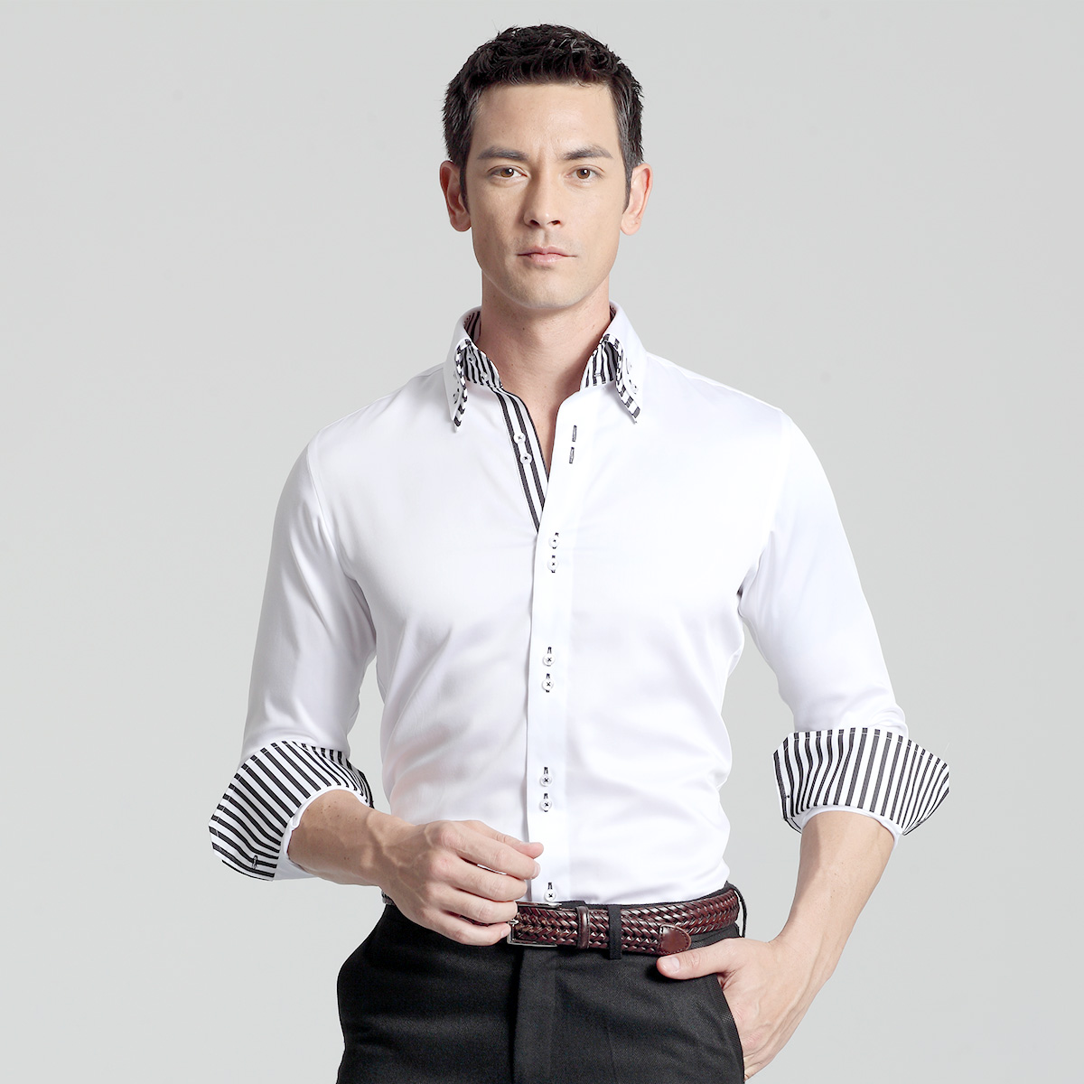 / 雙層領配黑白條紋襯衫男長袖絲光棉韓版修身純棉免燙男式秋裝襯衣