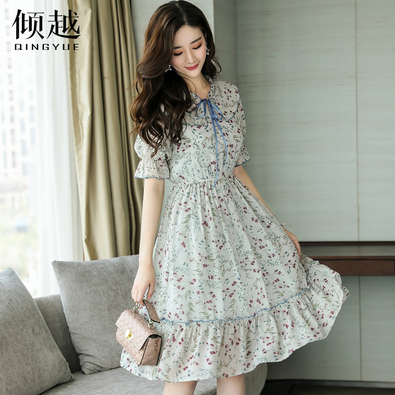 / 印花雪紡連衣裙2017夏季新款女裝韓版短袖大擺魚尾裙碎花打底裙潮