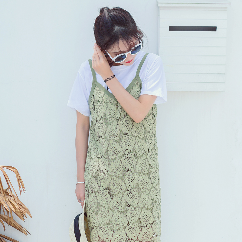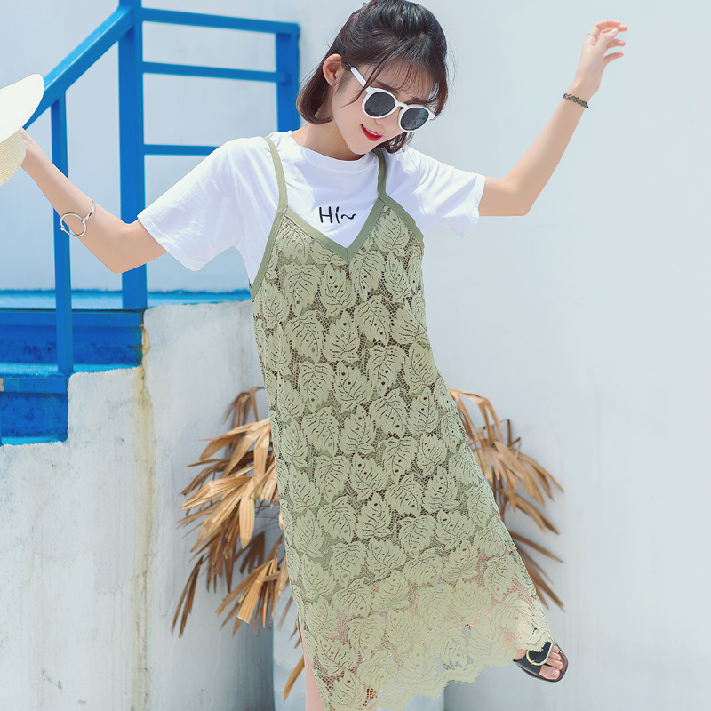 蕾絲吊帶連衣裙女夏裝新款女裝韓版修身學生鉤花小清新裙子潮