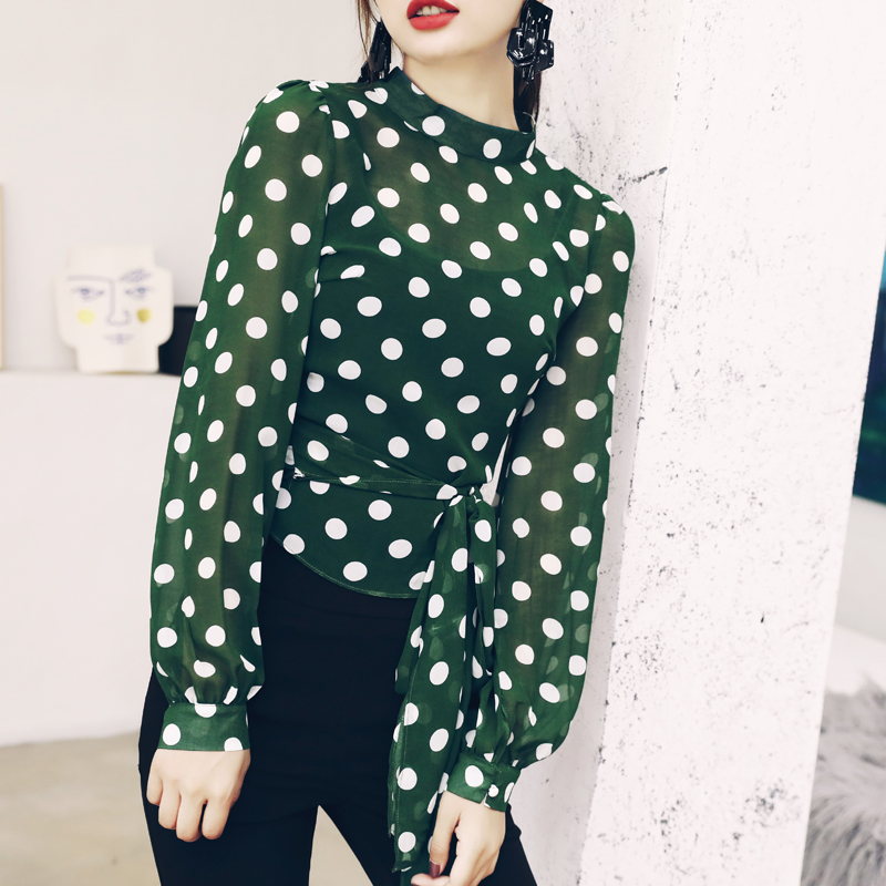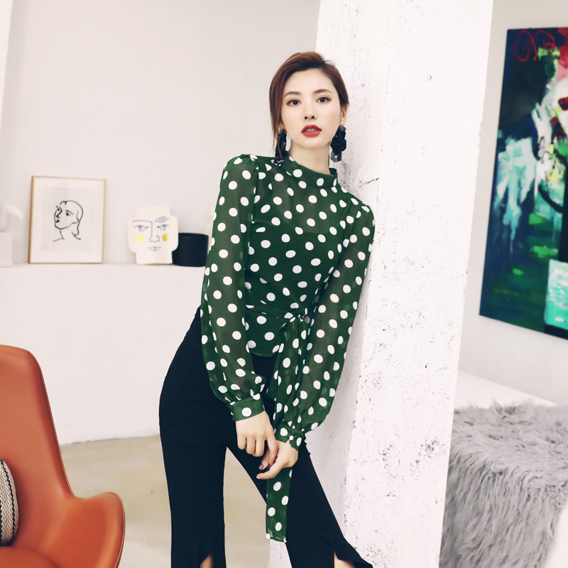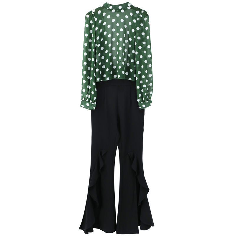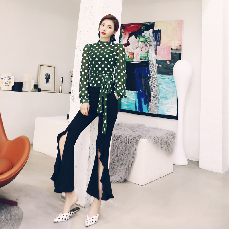 / 套裝褲女裝秋季2018新款韓版修身收腰波點長袖上衣開叉褲子兩件套