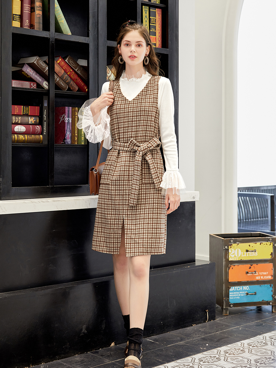 / MG小象中長款收腰連衣裙女秋裝新款白色長袖寬松上衣復古格子裙子