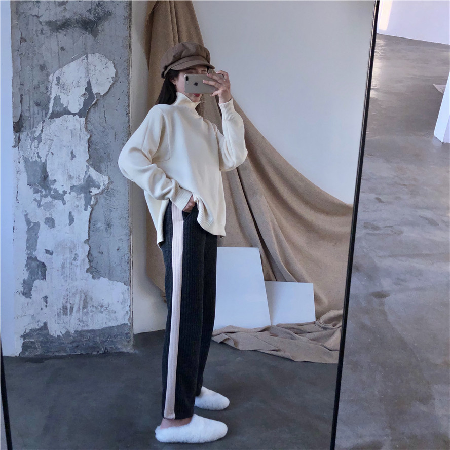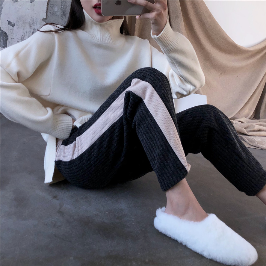 / 秋冬2018新款復古韓國針織墜感撞色闊腿褲女高腰直筒針織褲休閑褲