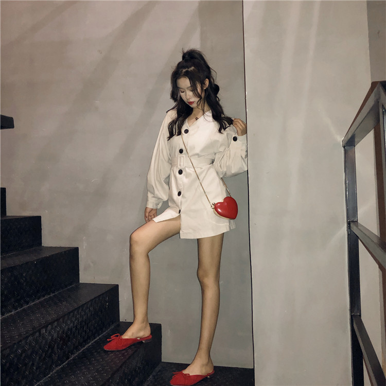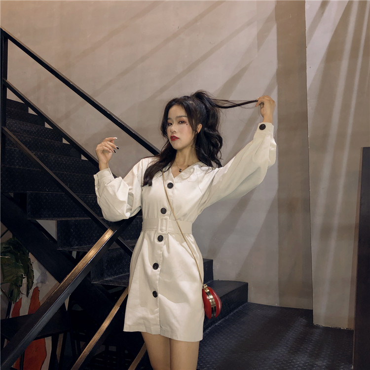 / 復古新款chic單排扣綁帶收腰顯瘦泡泡袖時髦氣質V領純色風衣裙潮