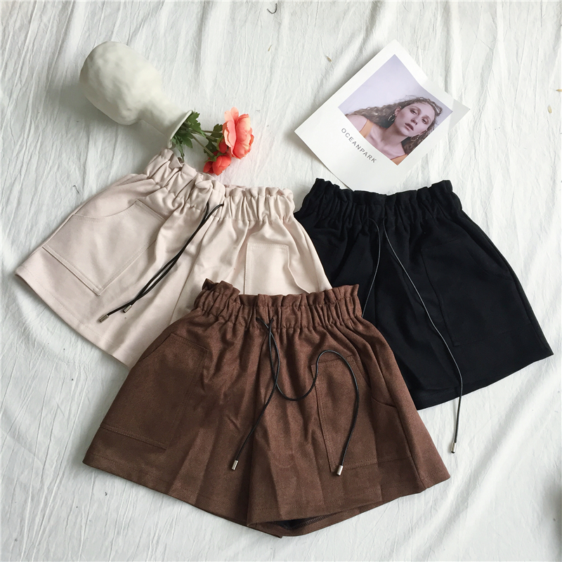 / 可可里小姐~秋冬新款韓版毛呢闊腿褲口袋寬松高腰闊腿休閑短褲