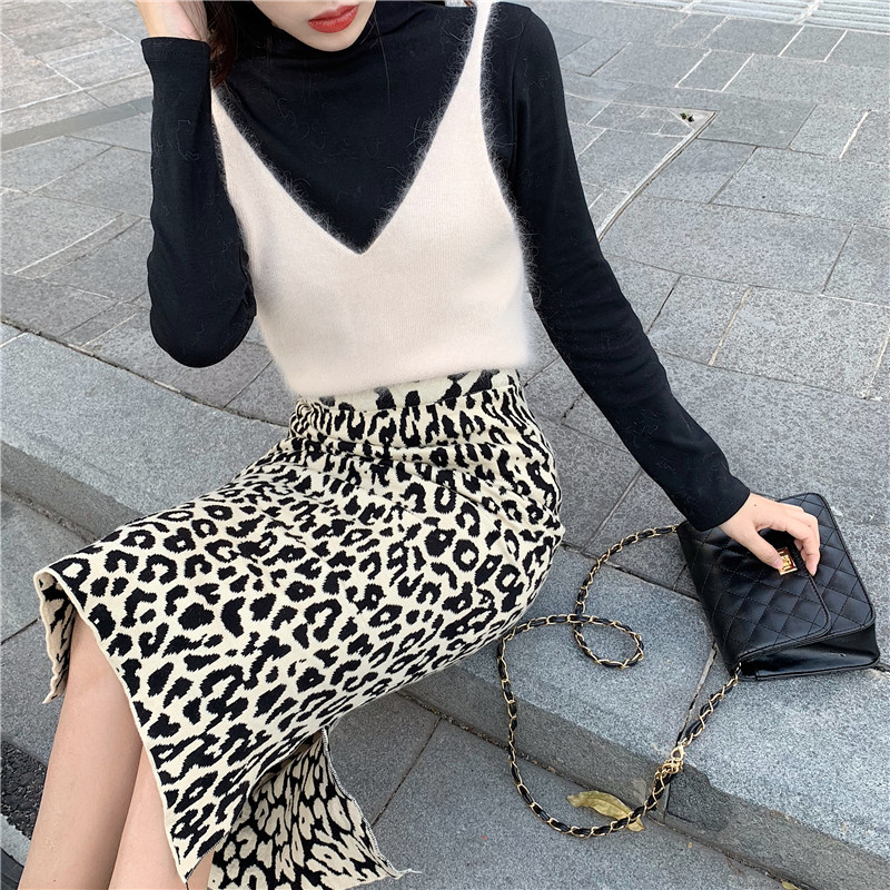 新款秋冬復古慵懶毛毛吊帶針織打底衫高腰針織豹紋半身裙時尚套裝