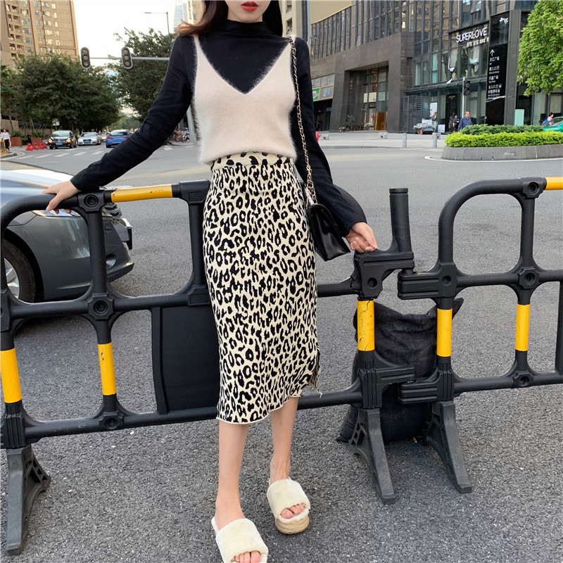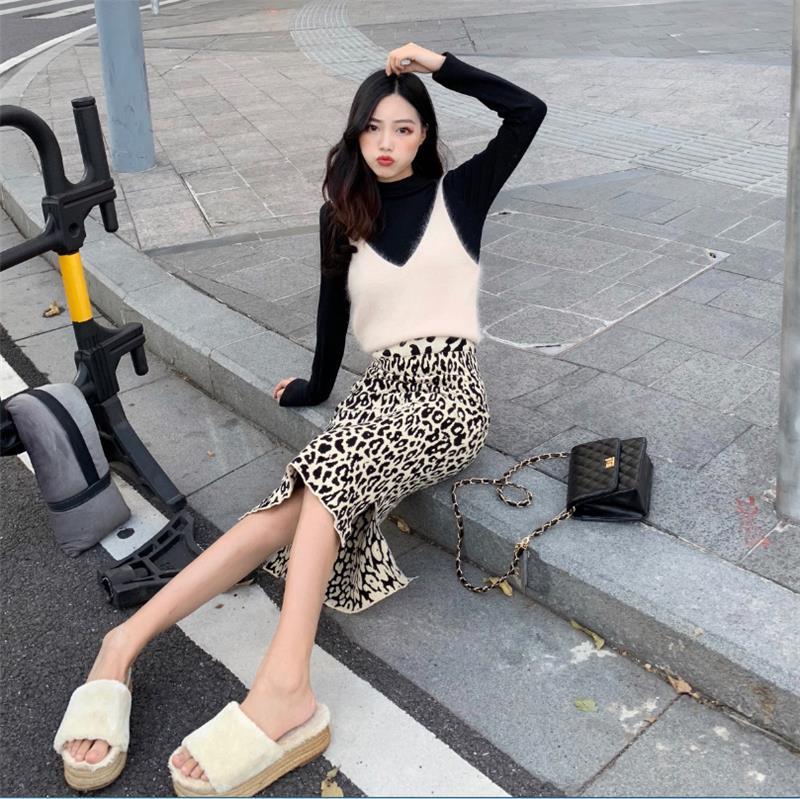 / 新款秋冬復古慵懶毛毛吊帶針織打底衫高腰針織豹紋半身裙時尚套裝