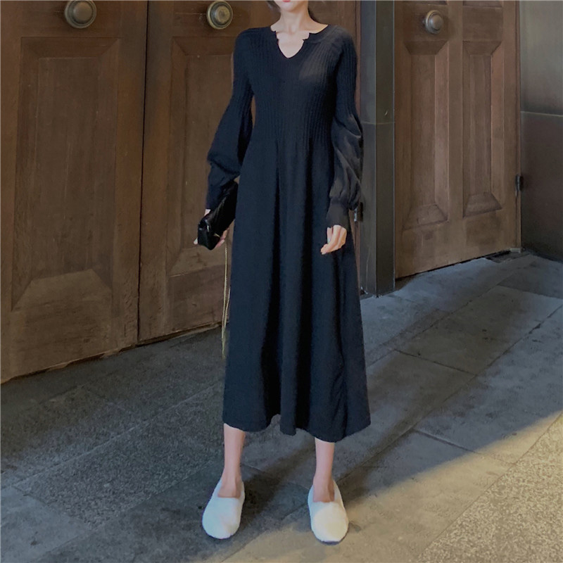 裙子女秋冬新款韓版簡約百搭長袖V領套頭針織連衣裙修身打底裙潮