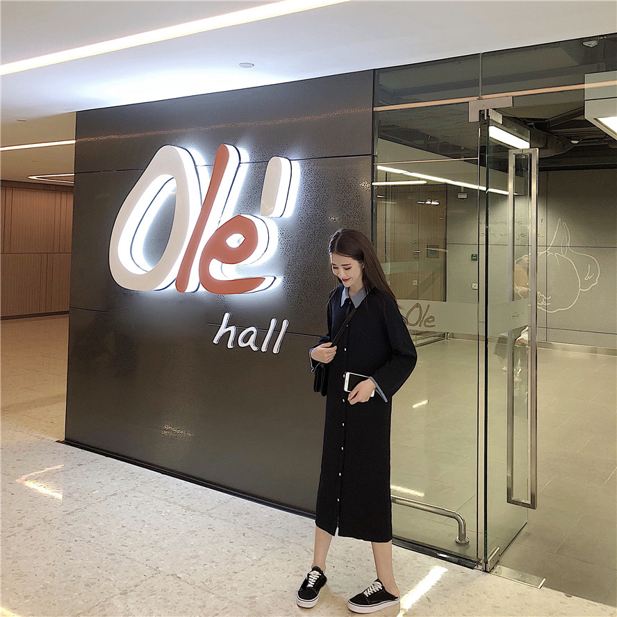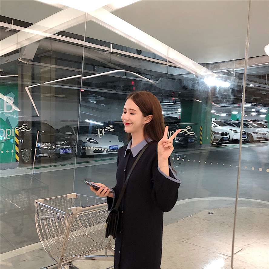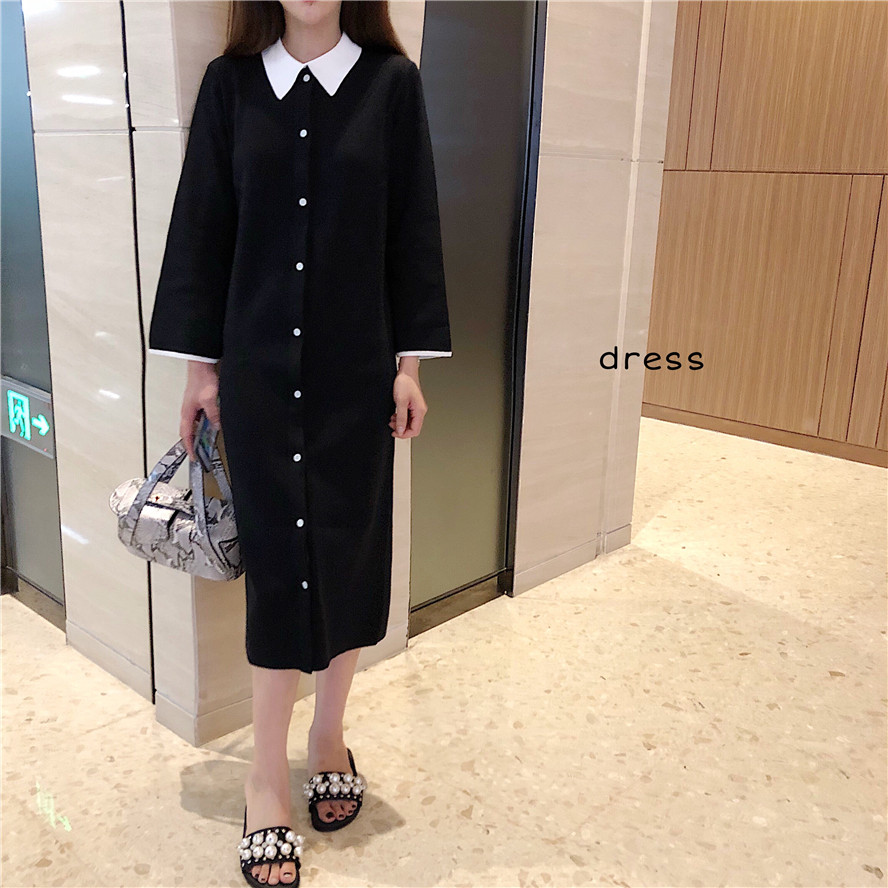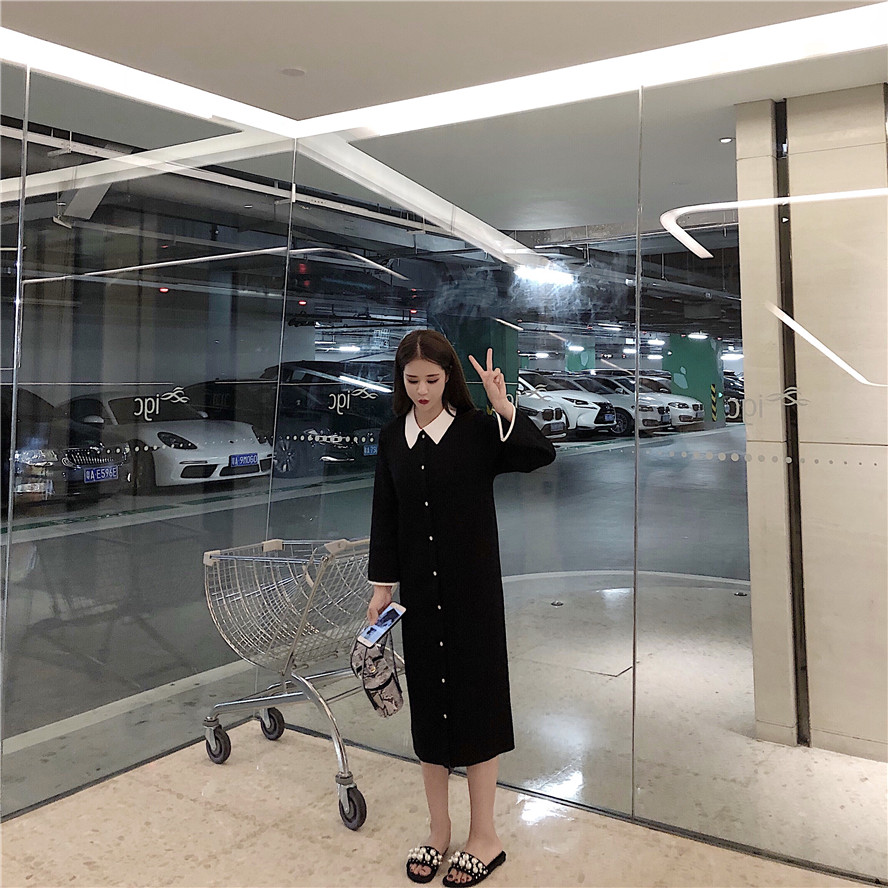/ 春秋長款撞色拼接polo領針織修身顯瘦學院風長袖連衣裙女2018新款