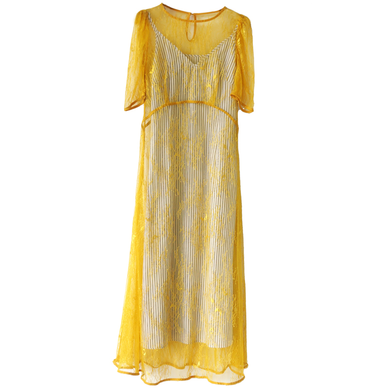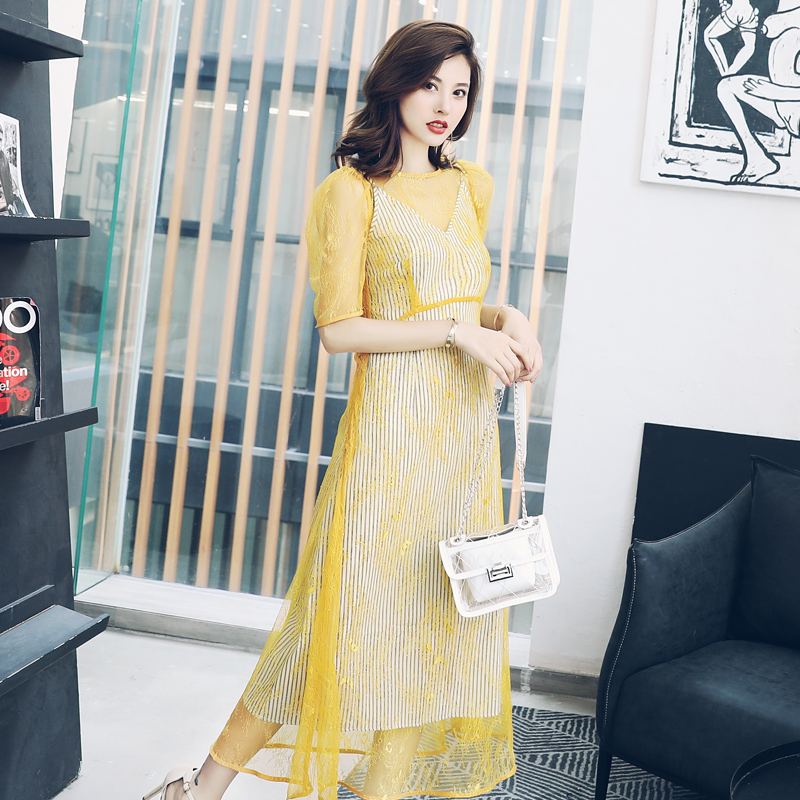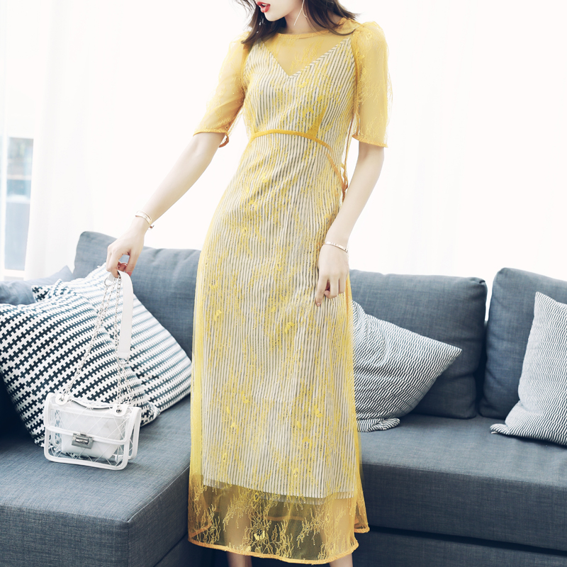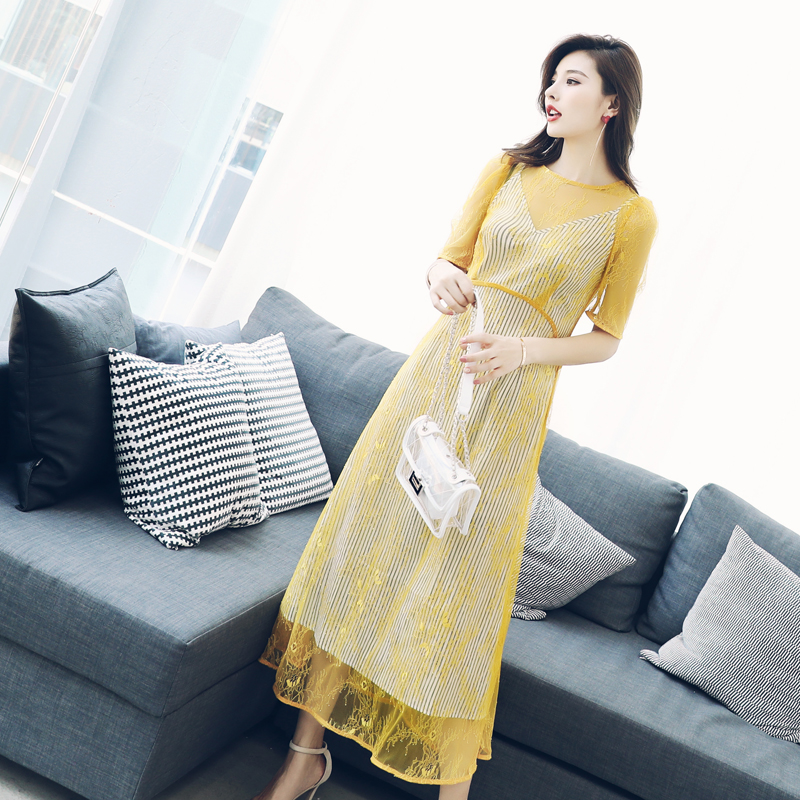 s秀名媛中長款蕾絲鏤空吊帶兩件套顯瘦裙子連衣裙女夏2018新款潮